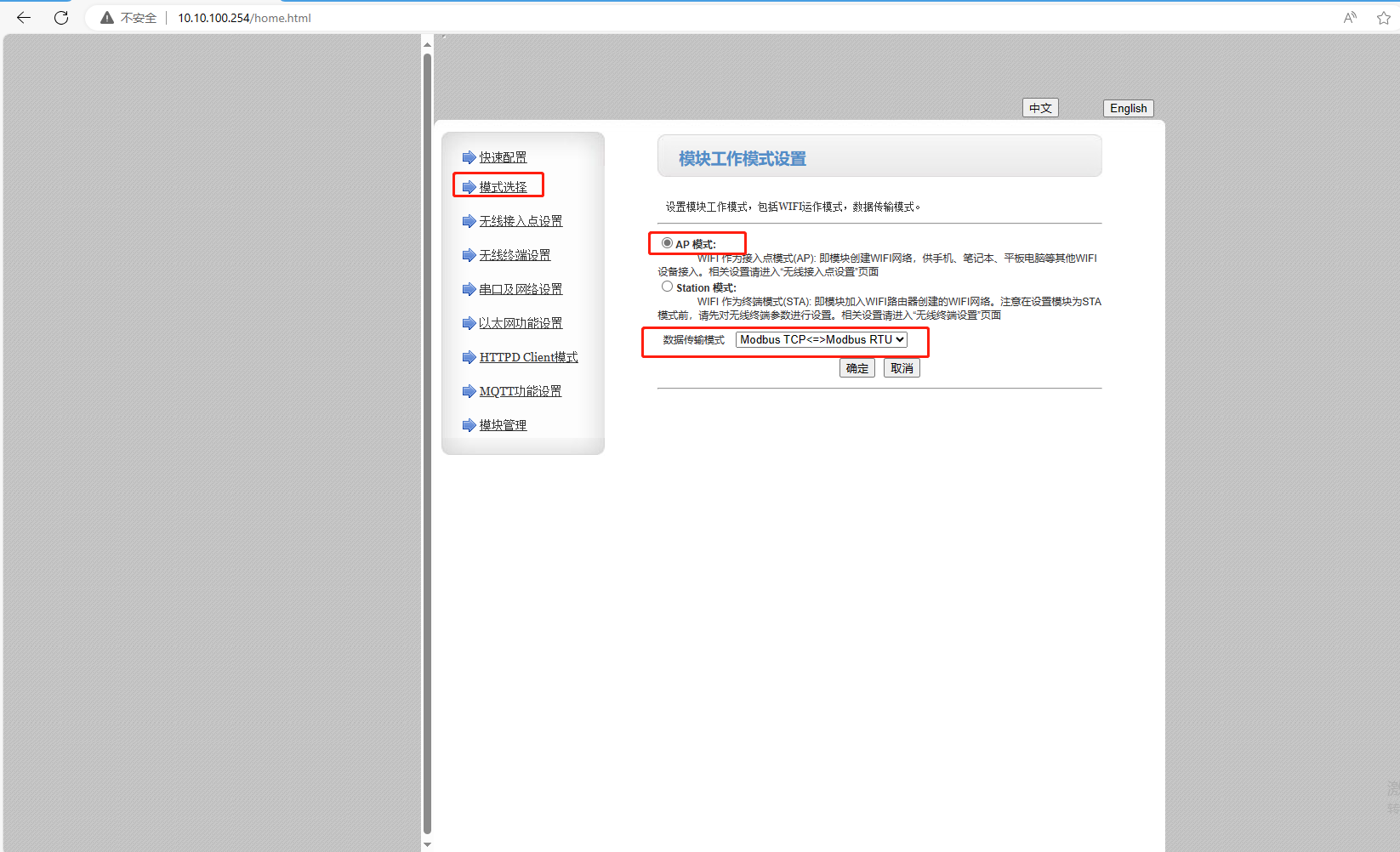 網(wǎng)頁上設(shè)置AP模式,開啟MODBUS TCP轉(zhuǎn)MODBUS RTU模式,點(diǎn)擊確定。