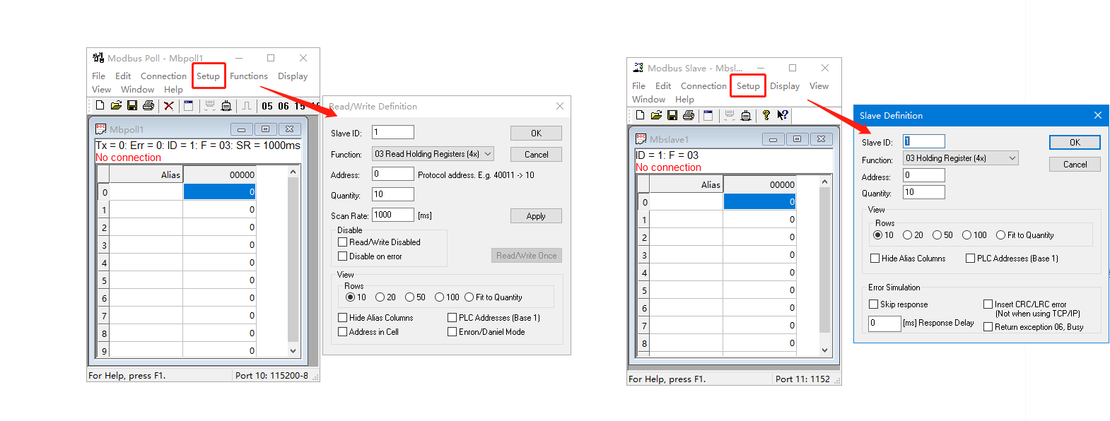 (2)打開MODBUS SLAVE軟件,點(diǎn)擊Setup