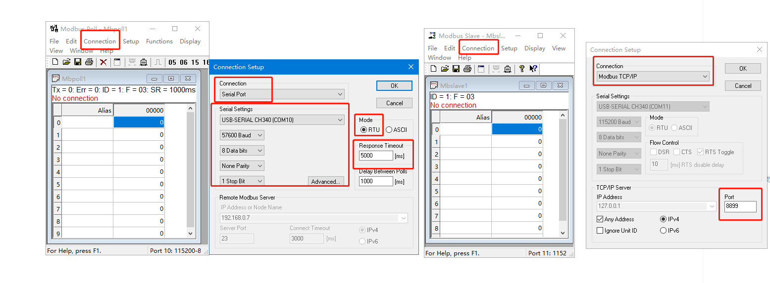 (2)Modbus Slave軟件,點(diǎn)擊Connection,選擇Modbus TCP/IP,Port端口8899。最后點(diǎn)擊OK。