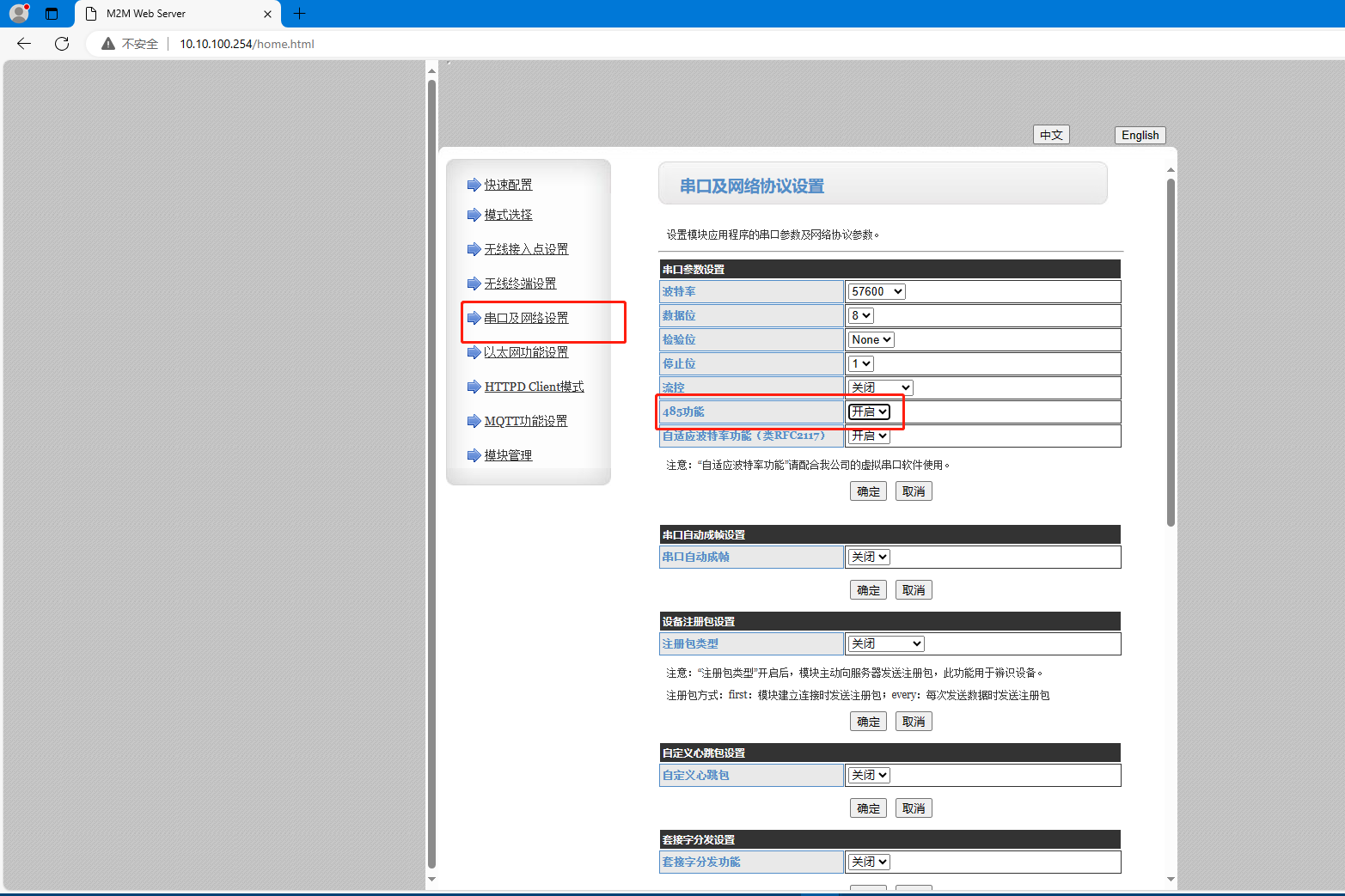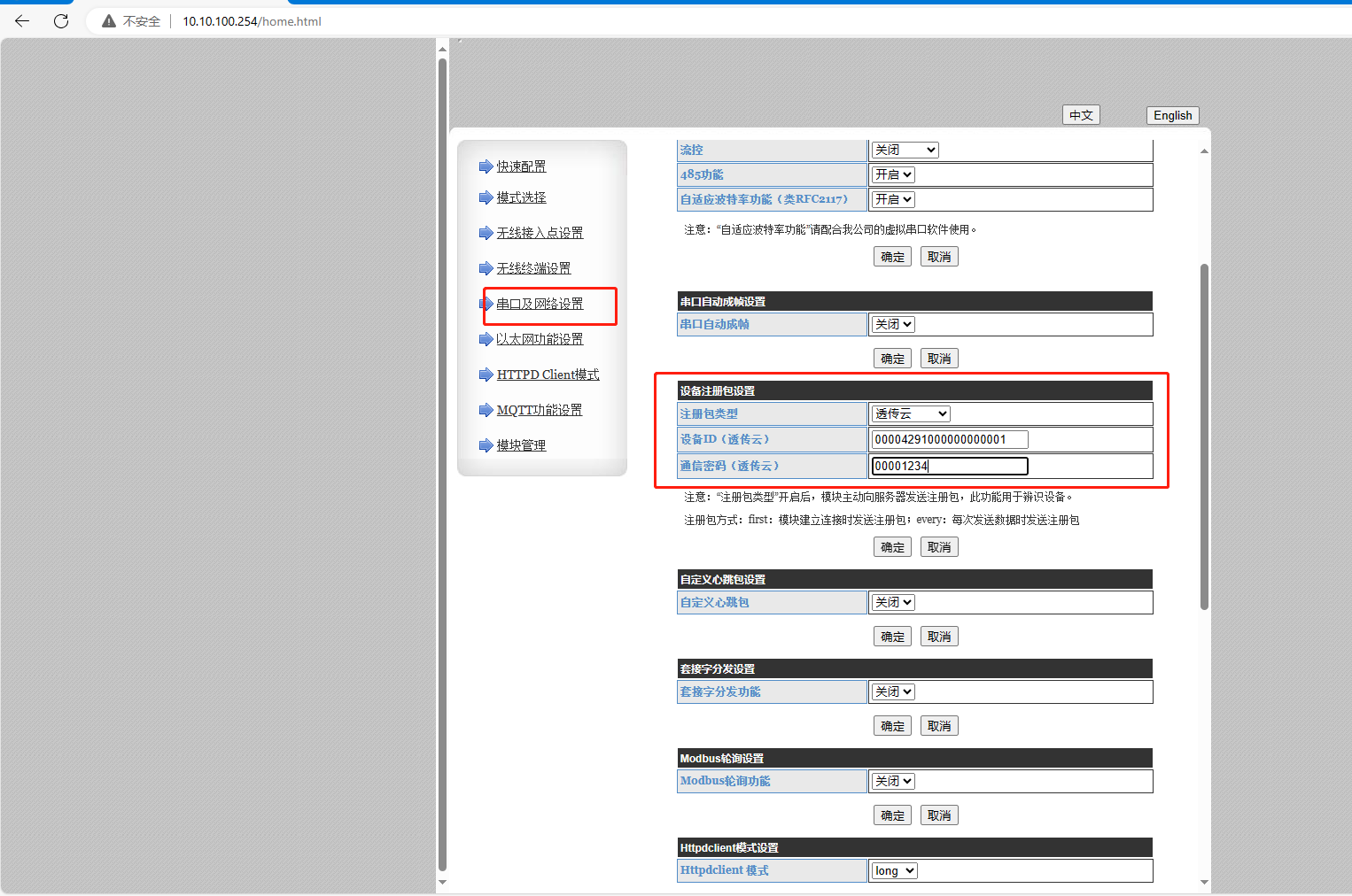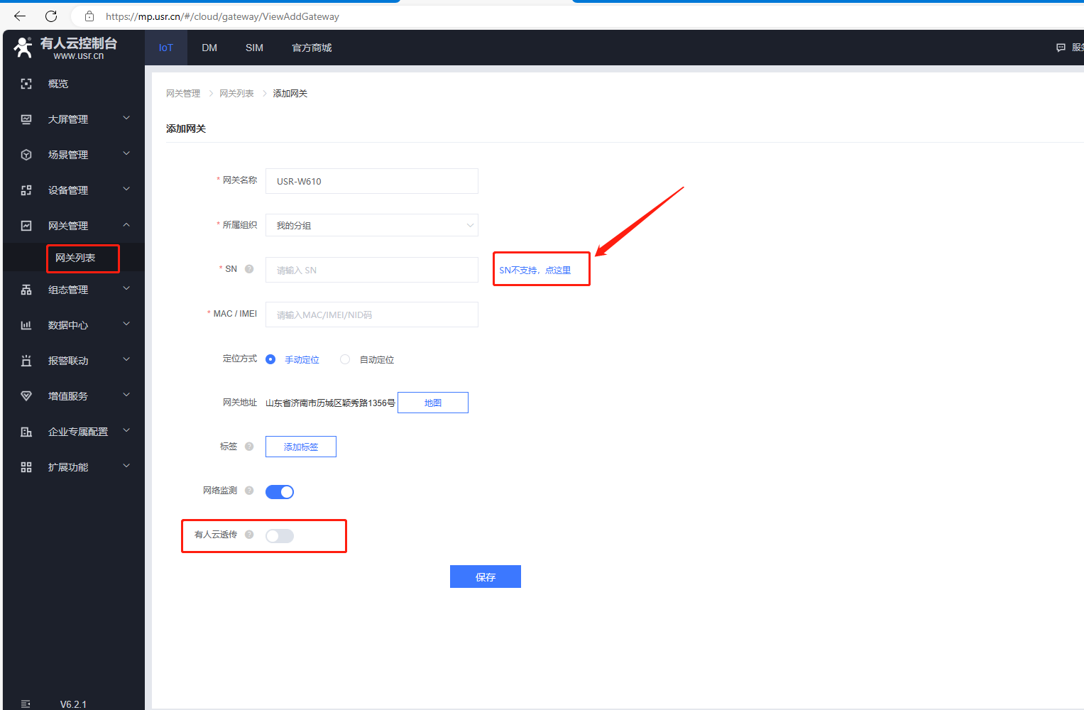 (2)W610添加有人云,點擊SN不支持點這里,有人云透傳功能需要關(guān)閉,點擊保存。