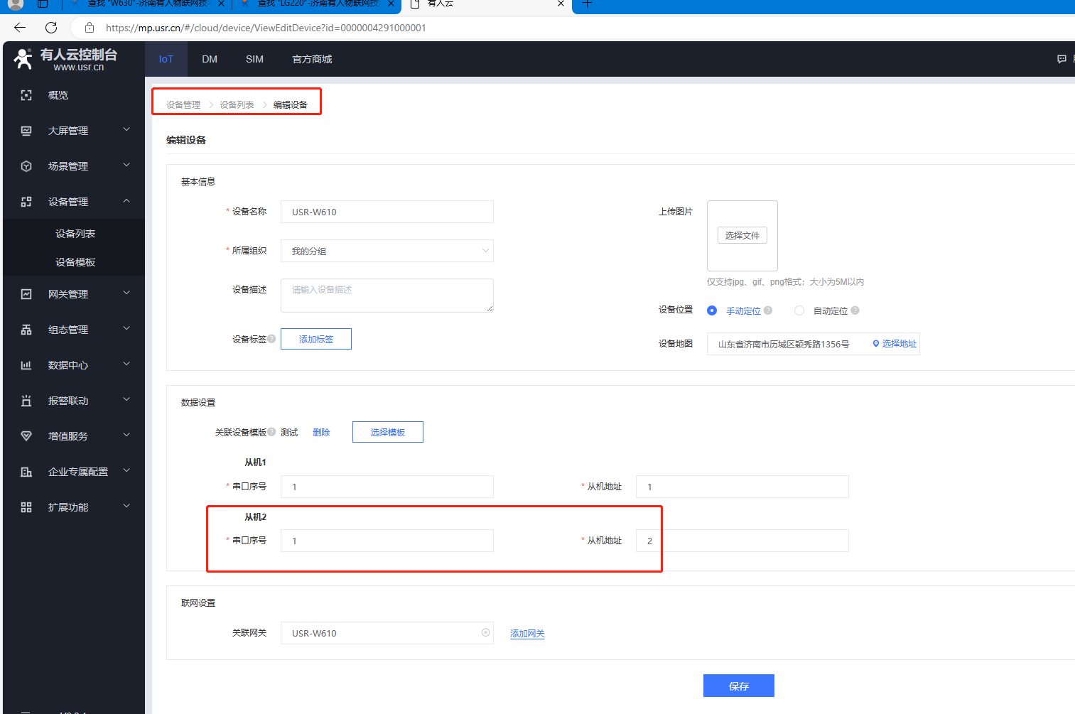 (3)點擊設(shè)備列表,點擊編輯,從機2,串口序號保持默認1,從機地址填2,點擊保存。
