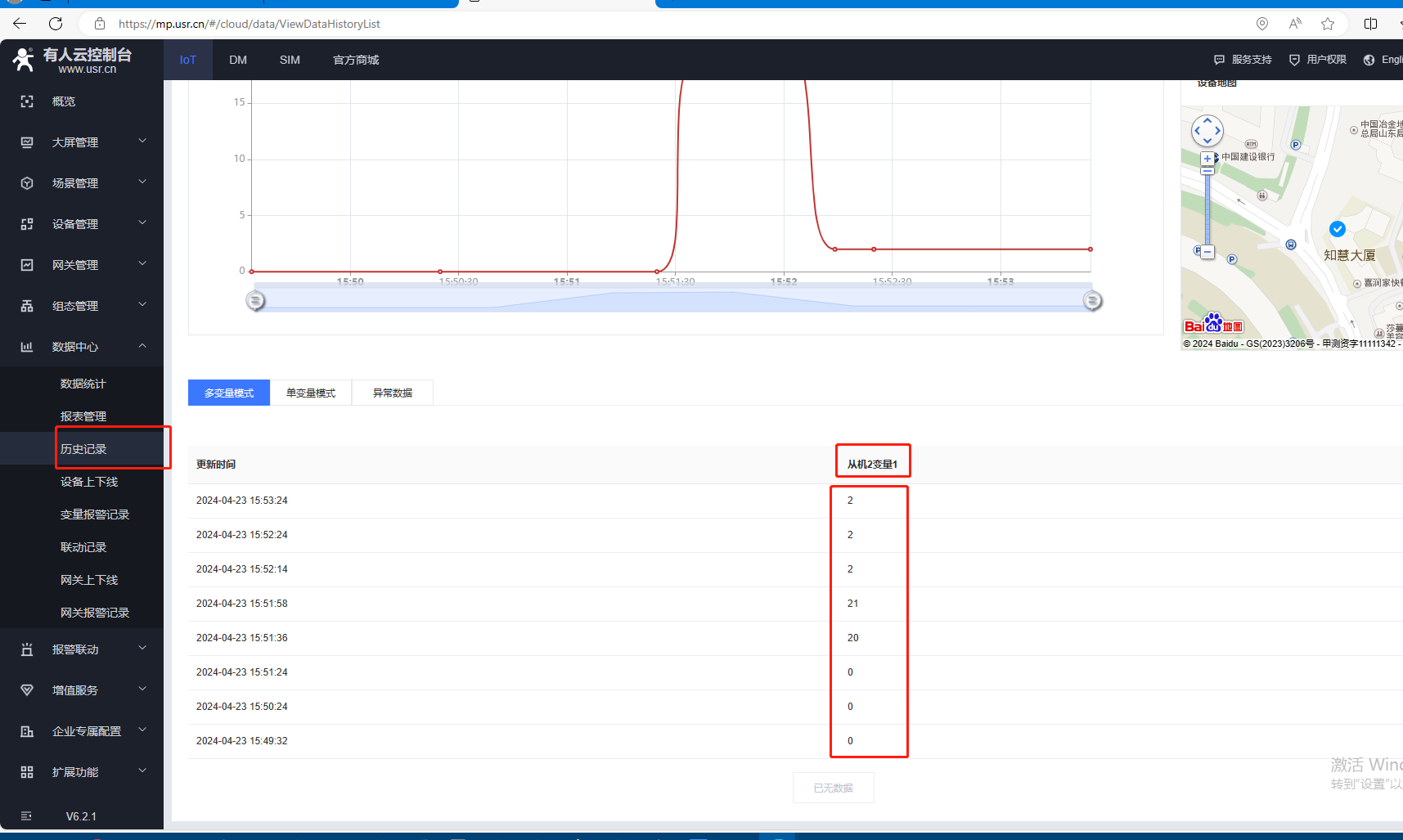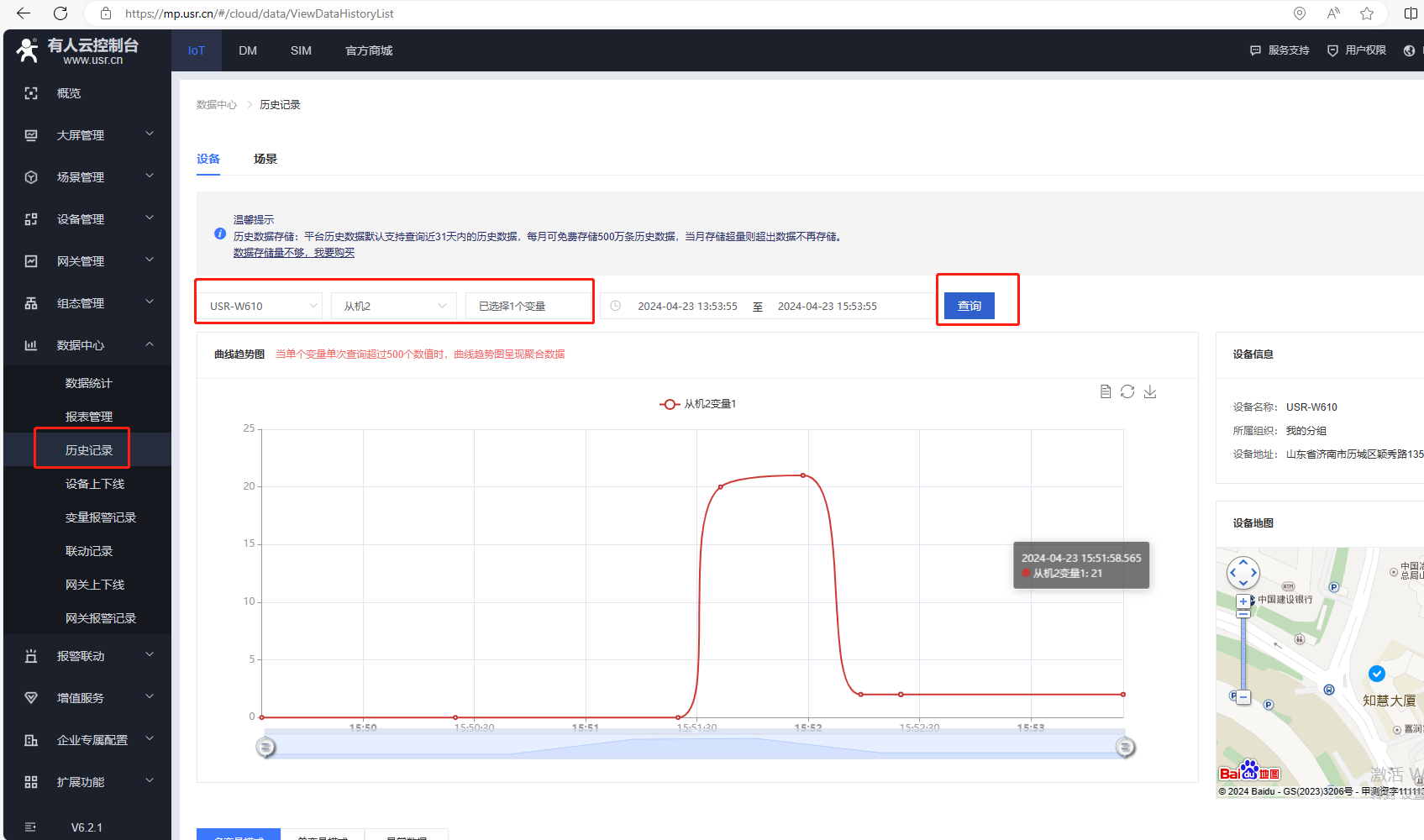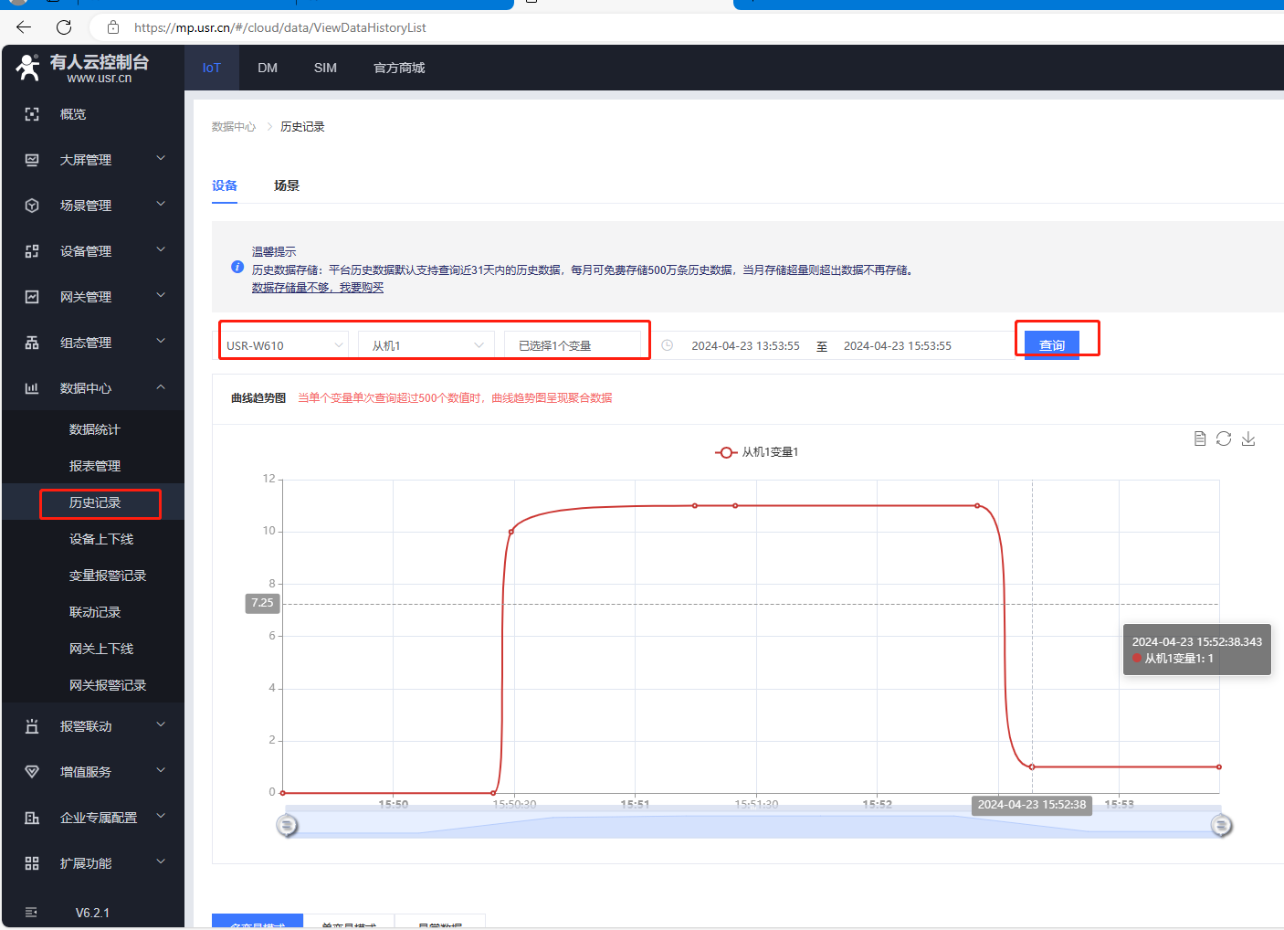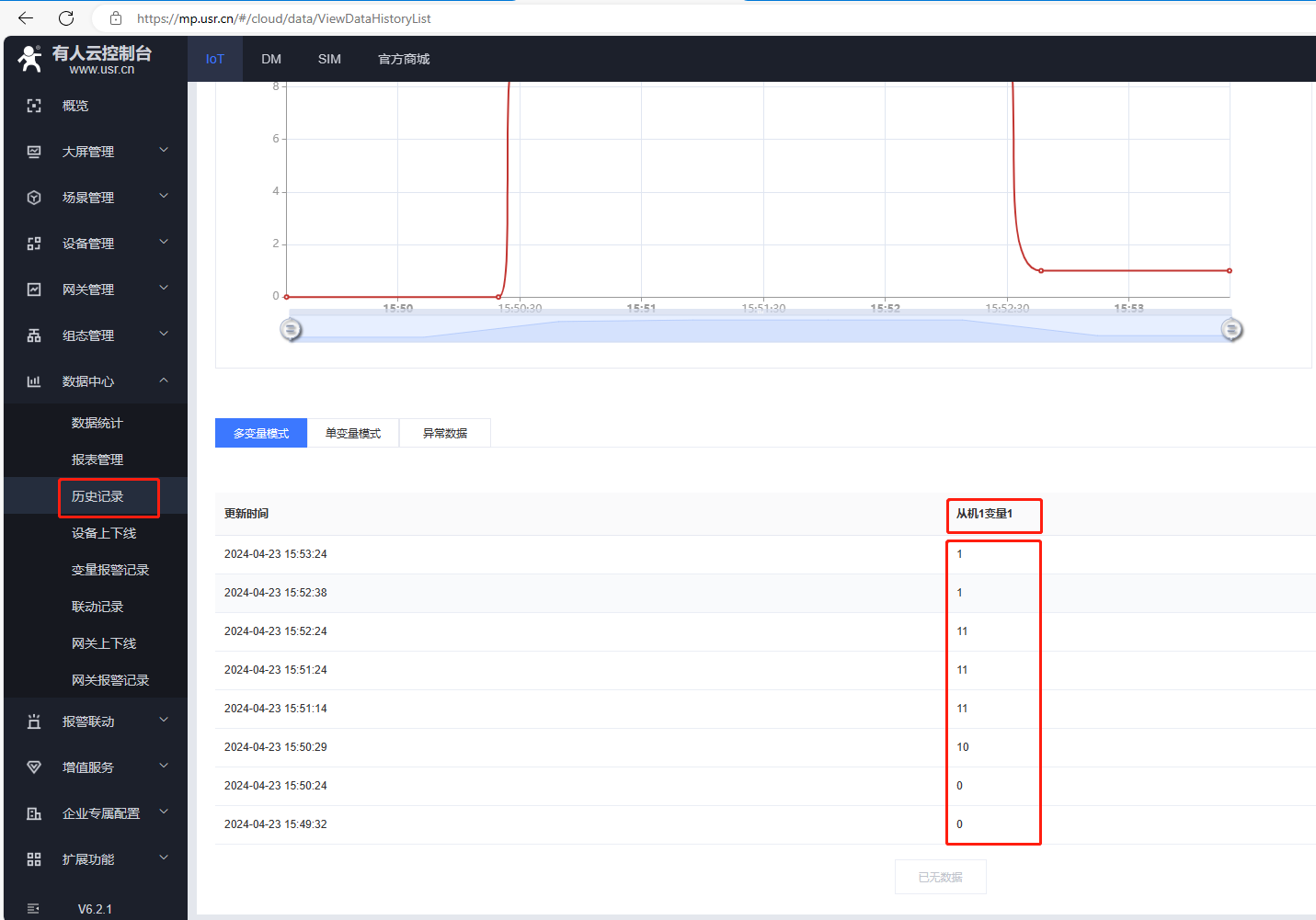 點開數(shù)據(jù)中心,點擊歷史記錄,可以查看有人云采集變量的歷史記錄。