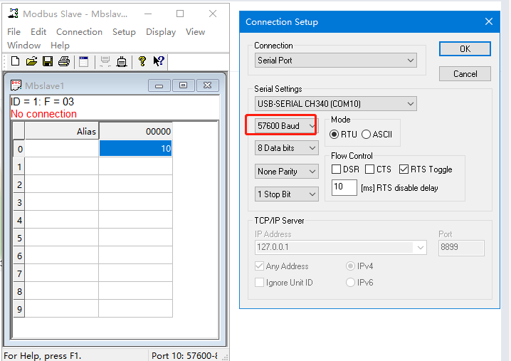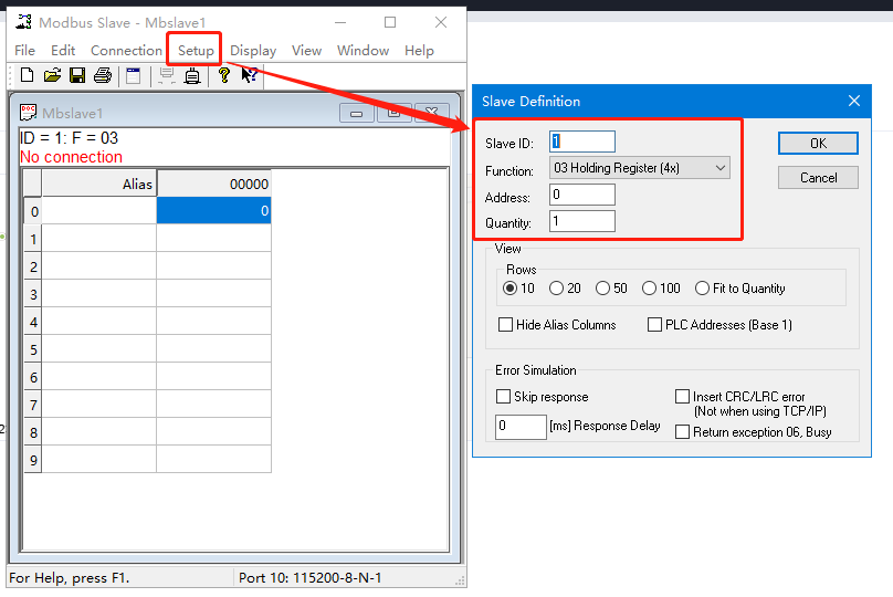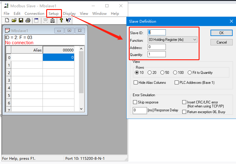 (1)第一個MODBUS SLAVE打開COM10,點擊Setup,Slave ID從機地址用1,F(xiàn)unction功能碼用03,Address寄存器起始地址用0,Quantity寄存器地址數(shù)量用1。