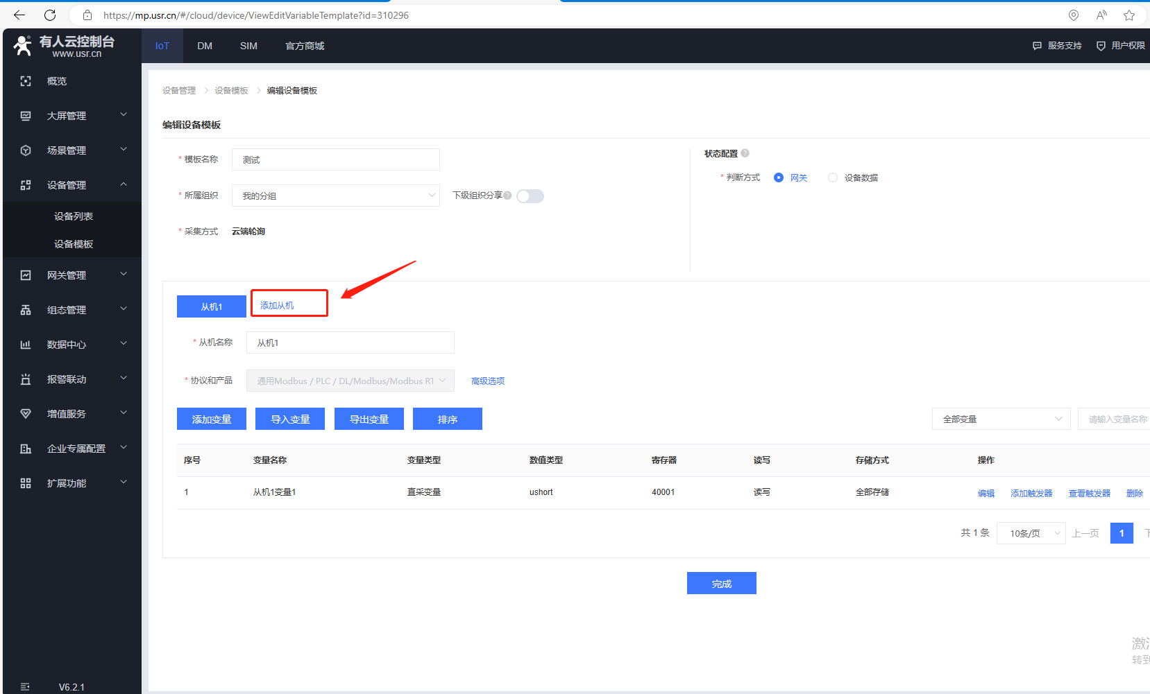 (1)點擊設(shè)備模板,點擊編輯,打開是否開啟多從機模式。