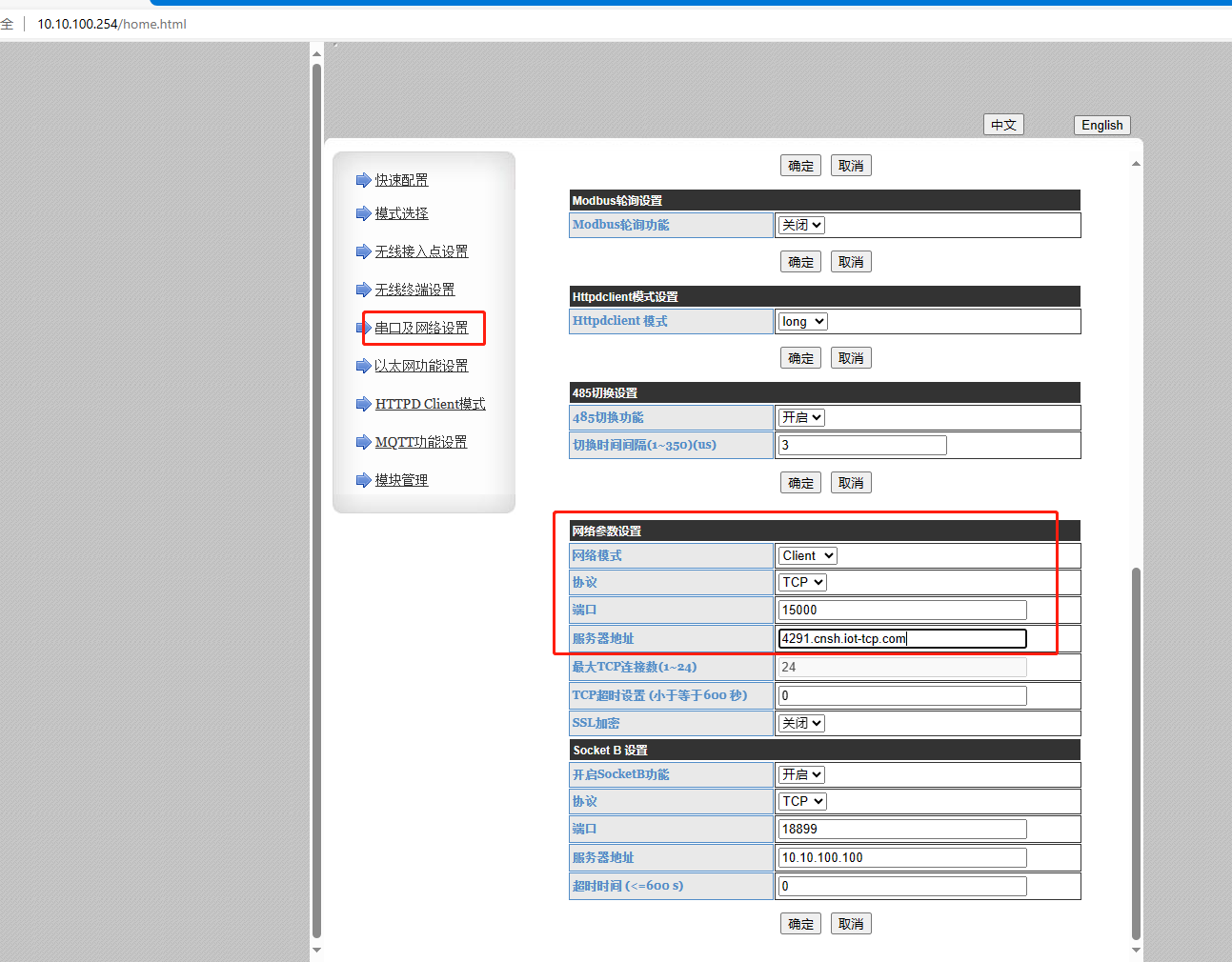 云平臺接入地址為: 4291.cnsh.iot-tcp.com; 端口號: 15000;