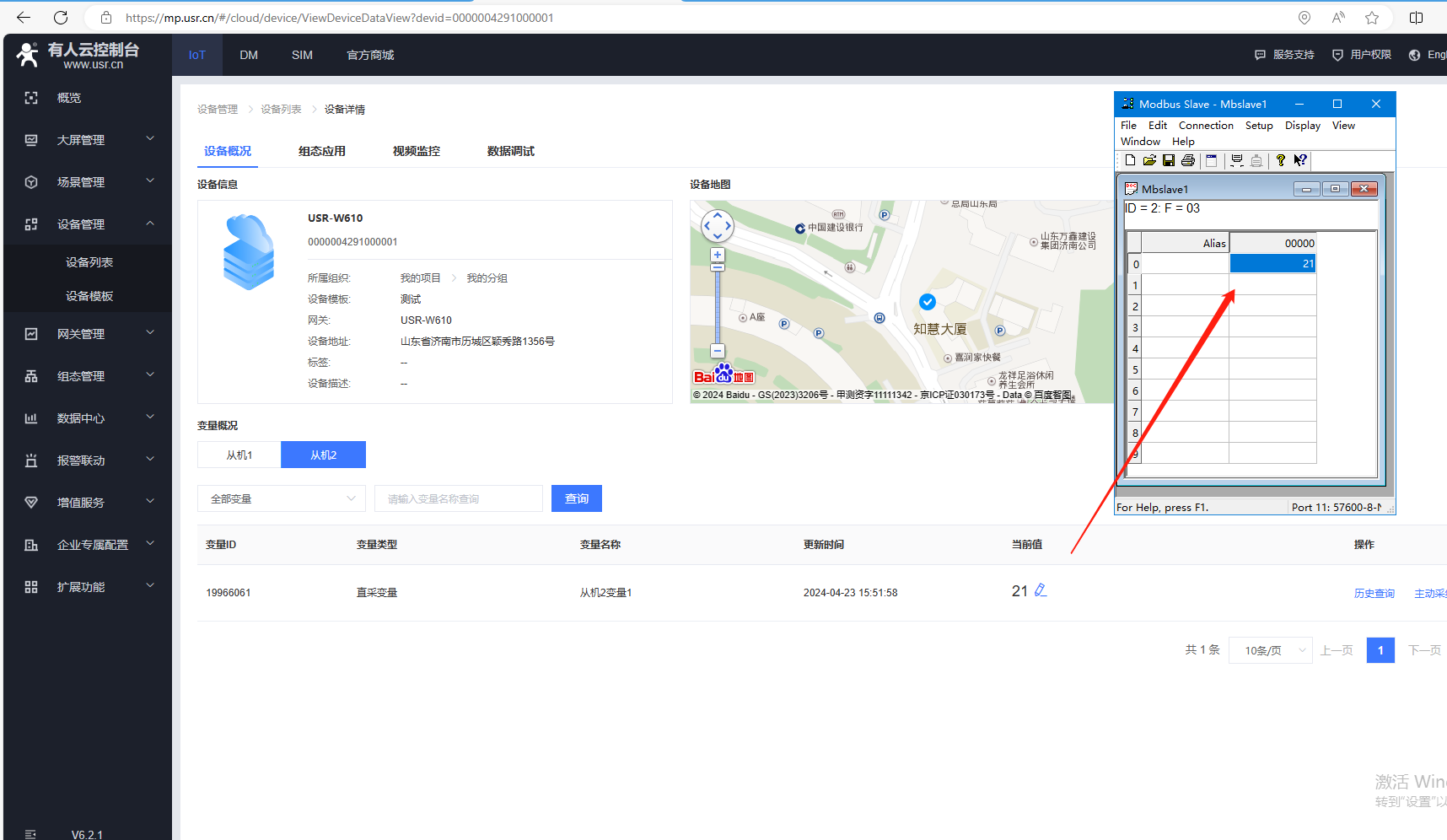 (2)改變第2個MODBUS SLAVE軟件的寄存器地址數(shù)據(jù)。COM11接的從機2,寄存器輸入20,有人云1分鐘采集數(shù)據(jù)20,有人云寫數(shù)據(jù)21,對應(yīng)MODBUS SLAVE串口寄存器顯示數(shù)據(jù)21。