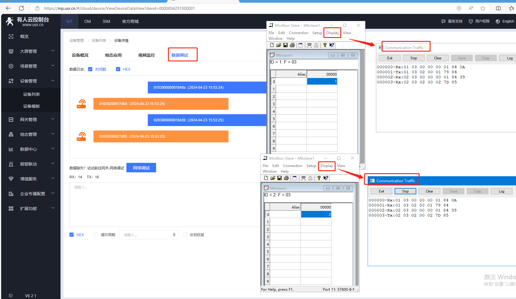 USR-W610的485串口接2個從機有人云云端輪詢示例