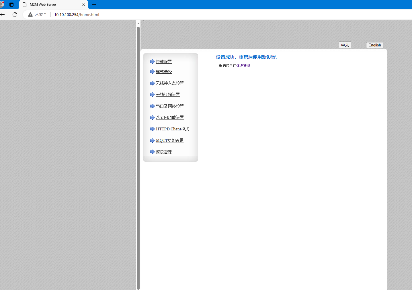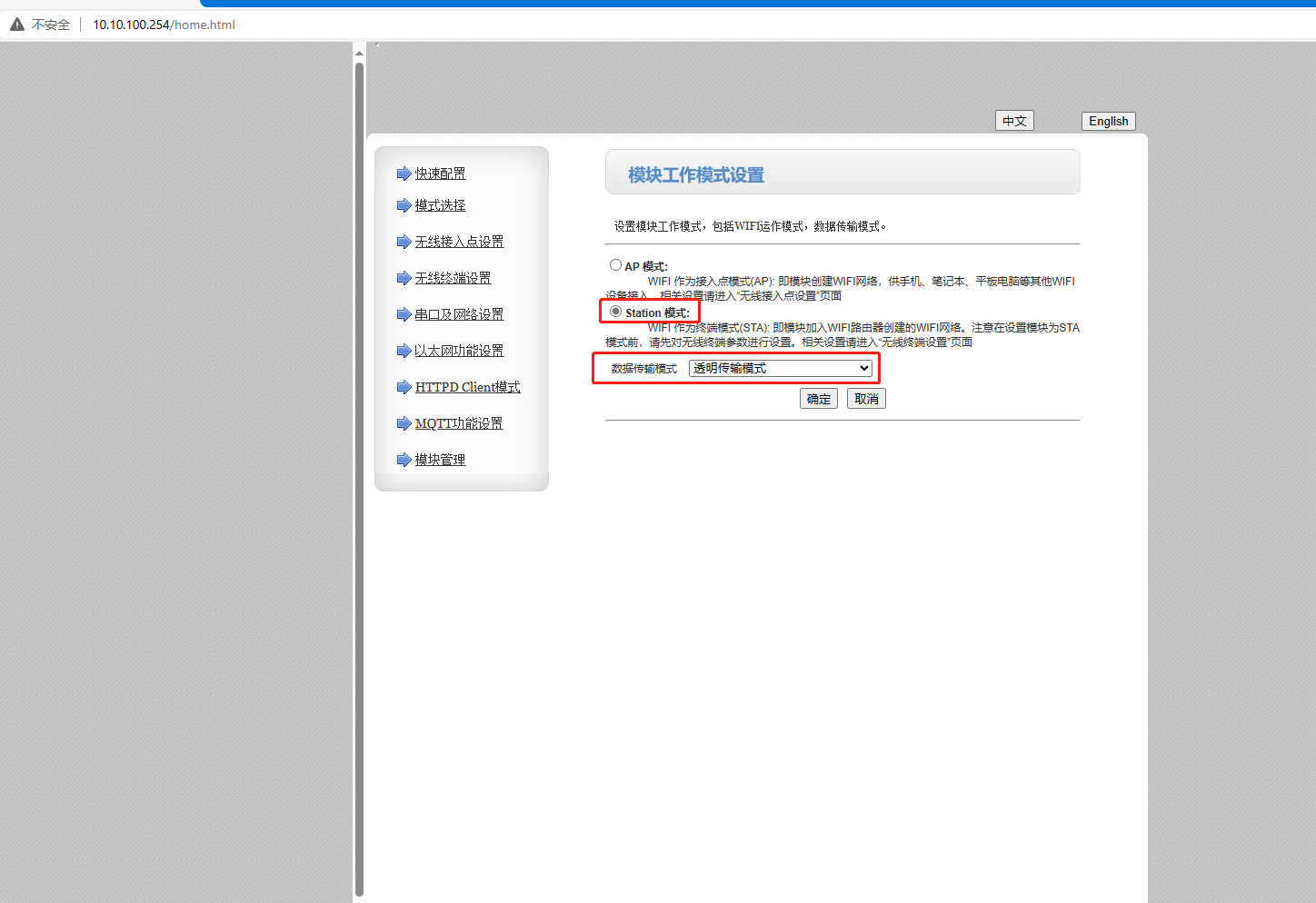 電腦連接W610的WiFi,瀏覽器輸入10.10.100.254登陸W610網(wǎng)頁,將工作模式設(shè)置STA,透明傳輸模式,點擊確定。