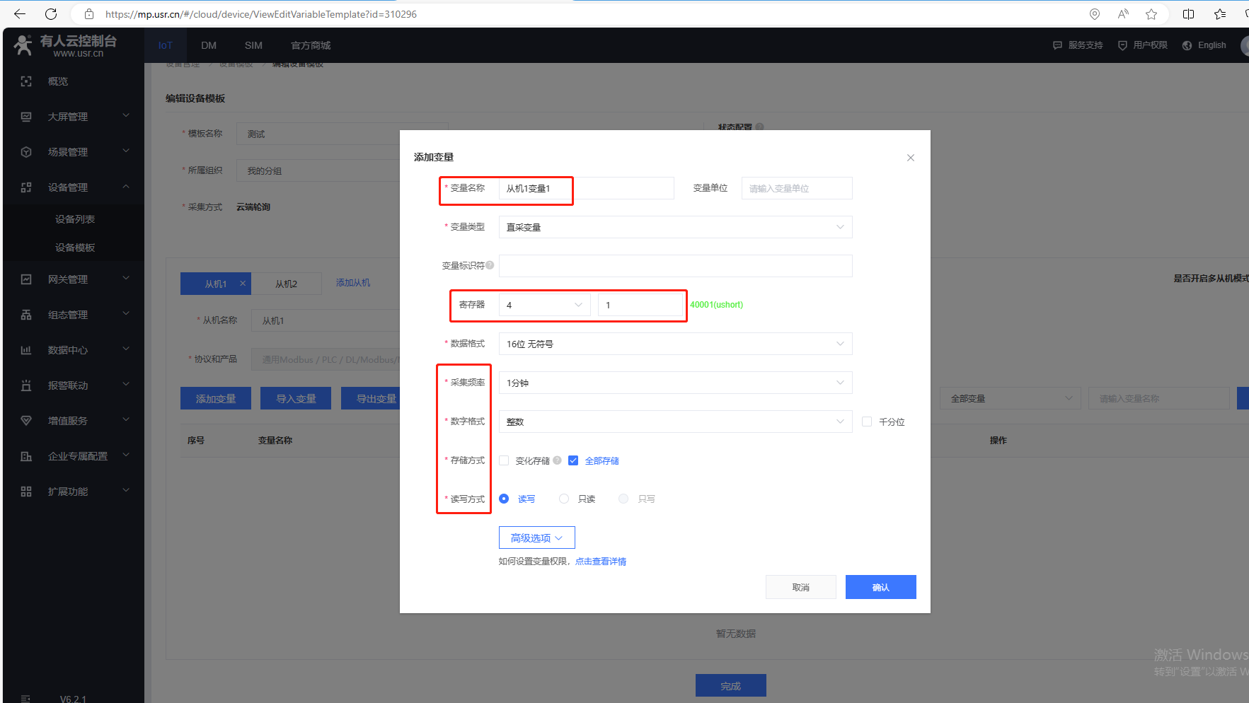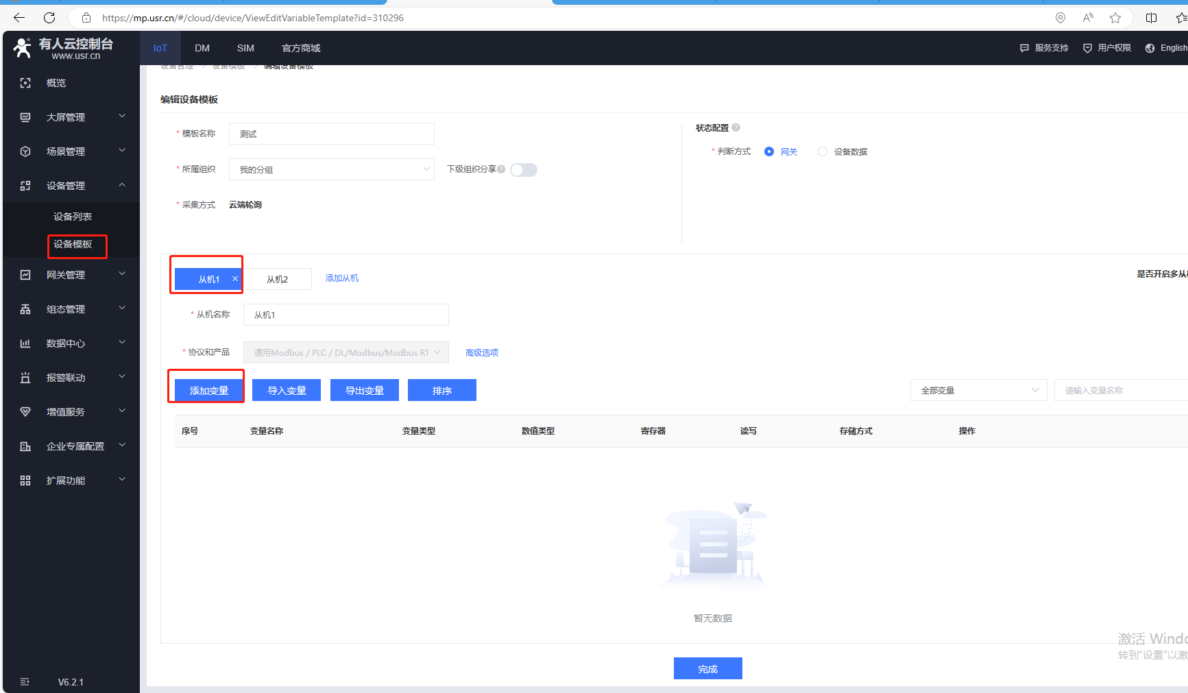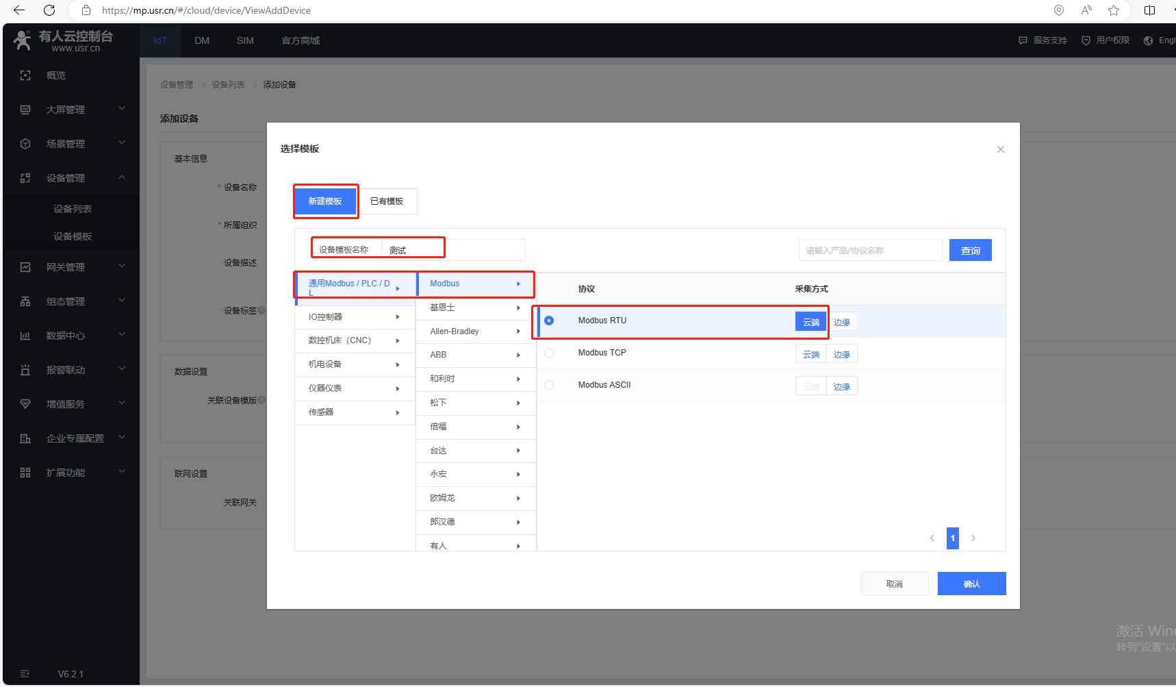 (2)點擊選擇模板,選擇新建模板,輸入設備模板名稱,通用Modbus/PLC/DL,選擇Modbus,協(xié)議選擇Modbus Rtu,采集方式云端,最后確認。