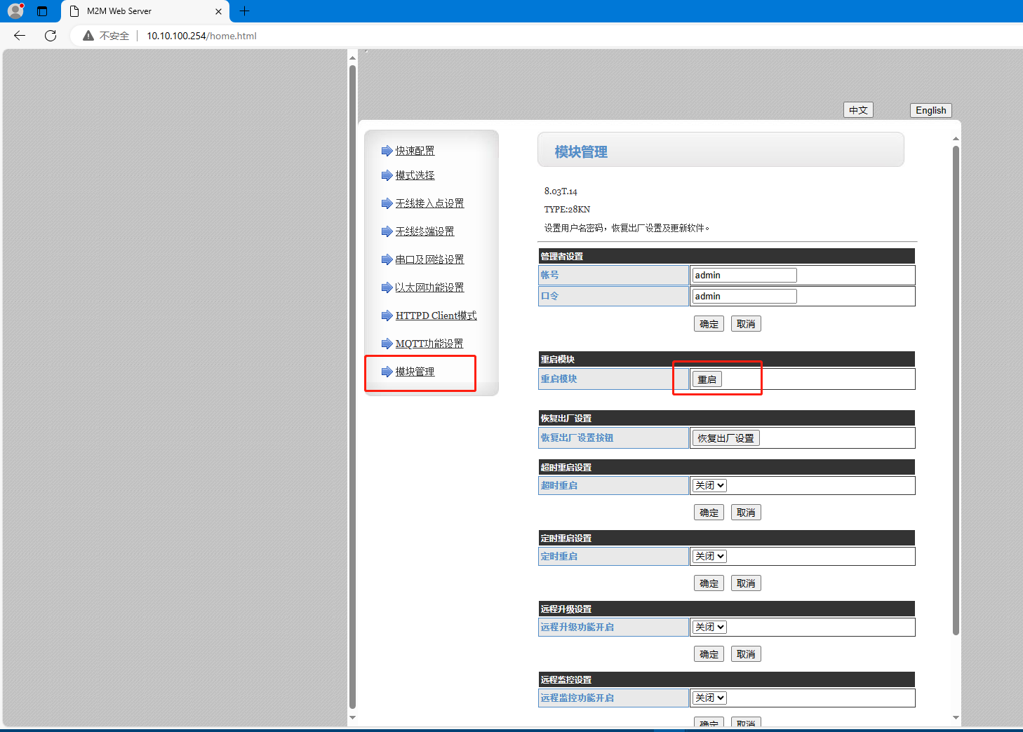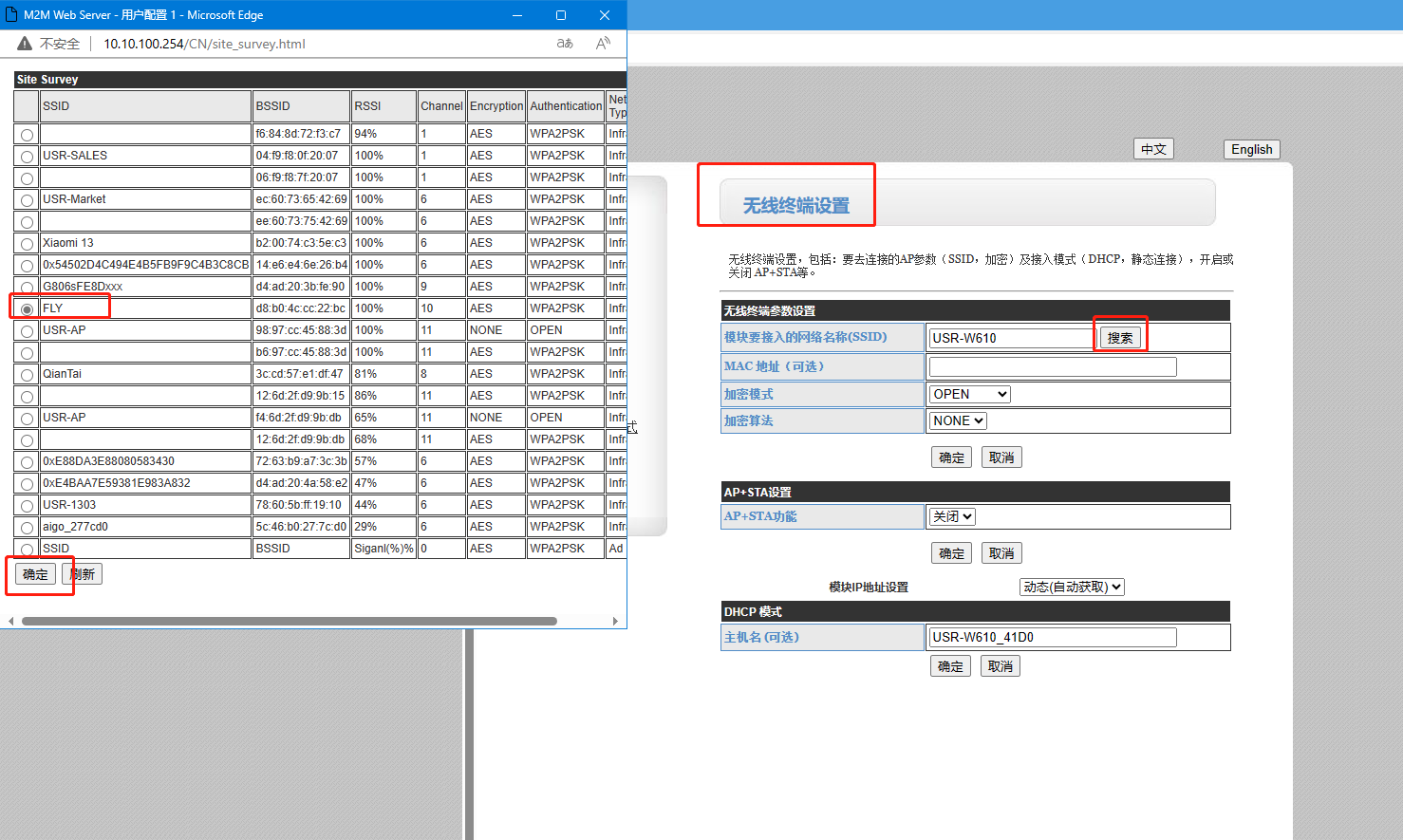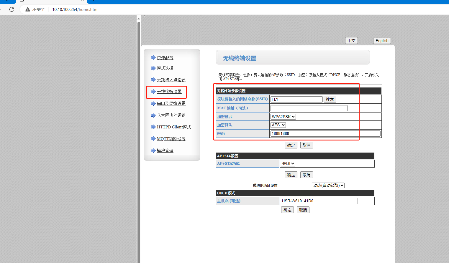 電腦連接W610的WiFi,瀏覽器輸入10.10.100.254登陸W610網(wǎng)頁,將工作模式設置STA,透明傳輸模式,點擊確定。