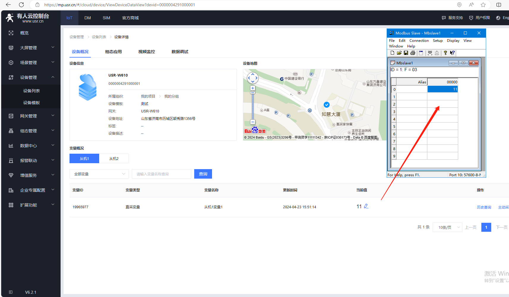 改變MODBUS SLAVE軟件的寄存器地址數(shù)據(jù)。COM10接的從機1,寄存器輸入10,有人云1分鐘采集數(shù)據(jù)10,有人云寫數(shù)據(jù)11,對應MODBUS SLAVE串口寄存器顯示數(shù)據(jù)11。