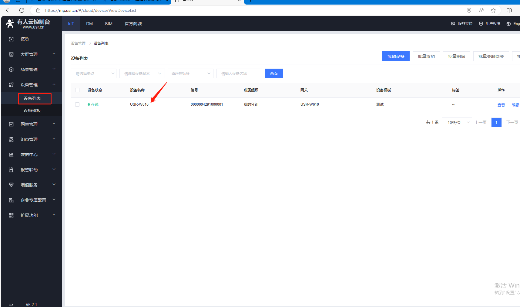 W610 STA模式連接可以聯(lián)外網(wǎng)的路由器,可以登陸有人云,看到網(wǎng)關列表、設備列表中,W610產(chǎn)品網(wǎng)關狀態(tài)是在線。