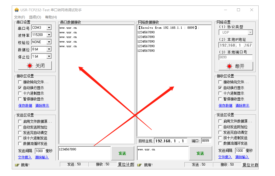 3、測試數(shù)據(jù)通訊,可以先網(wǎng)絡(luò)端向串口端發(fā)送數(shù)據(jù),串口端再向網(wǎng)絡(luò)端發(fā)送數(shù)據(jù),
