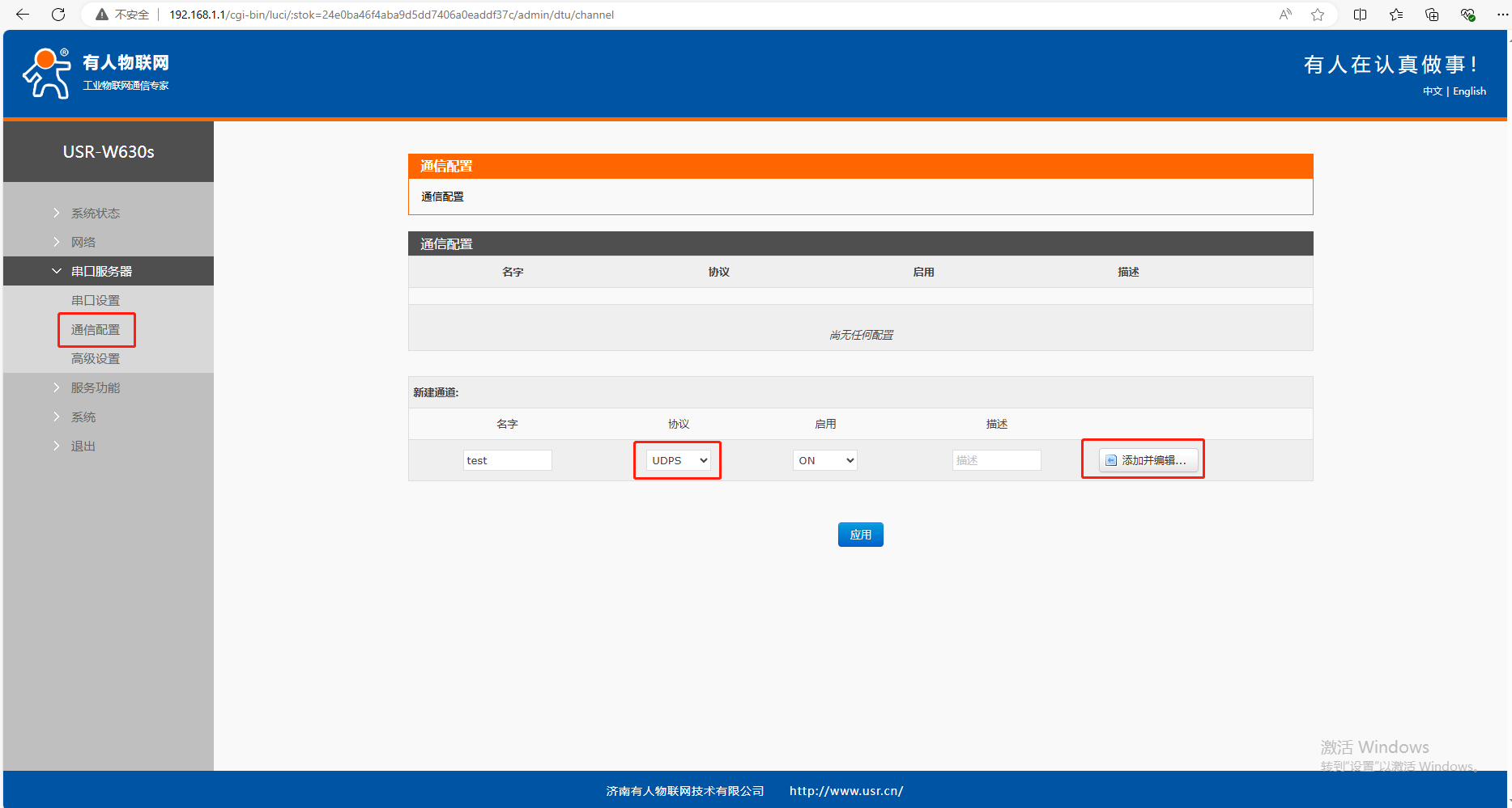 (1)通信配置,新建通道,協(xié)議UDPS,啟用ON,點(diǎn)擊添加并編輯。