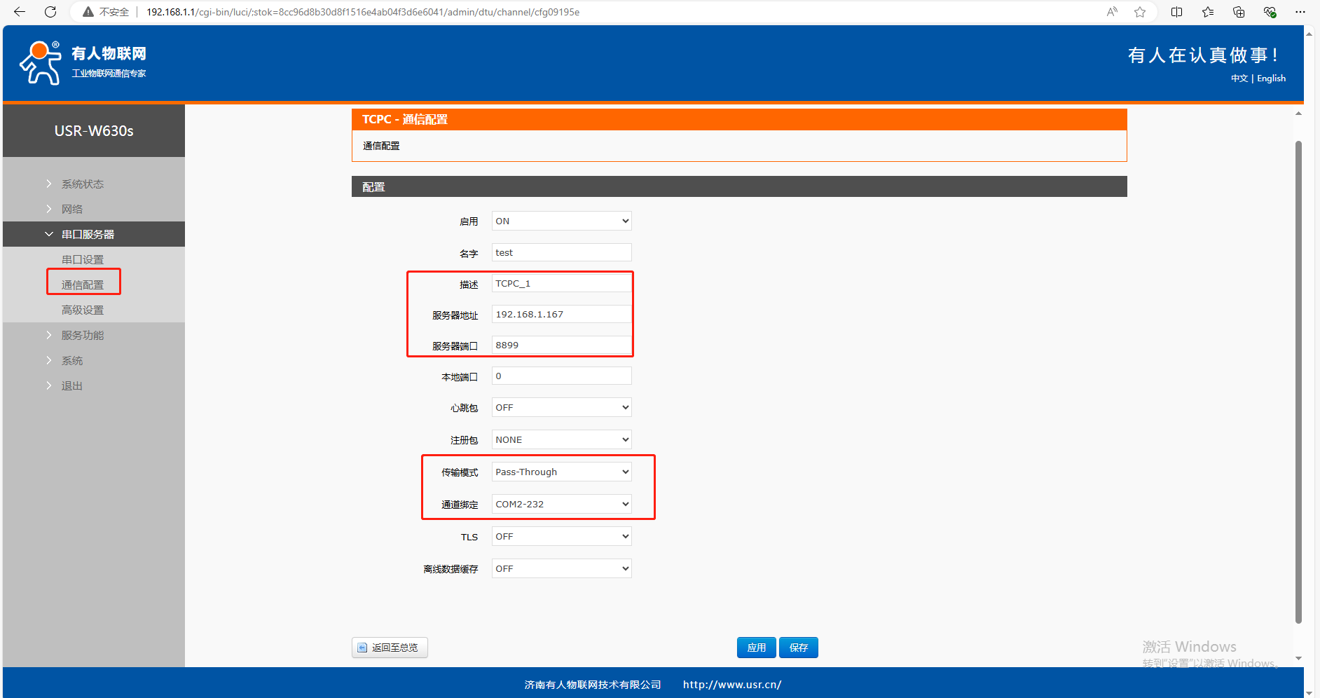 (2)跳轉(zhuǎn)到TCPC-通信配置頁面,服務(wù)器地址填電腦IP 192.168.1.167,服務(wù)器端口填8899,傳輸模式選擇Pass-Through,通道綁定選擇COM2-232。點(diǎn)擊應(yīng)用。