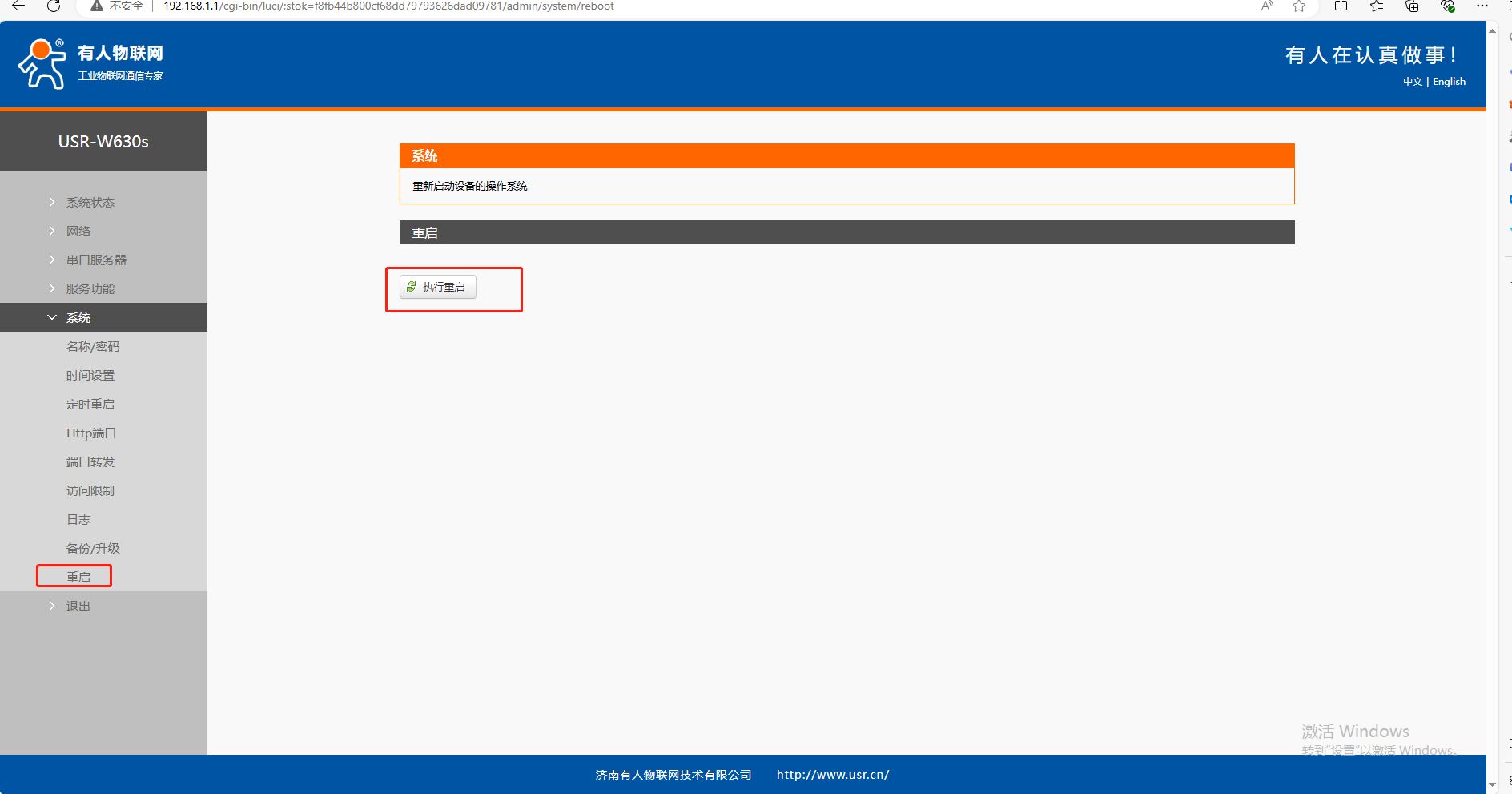 點(diǎn)開系統(tǒng),點(diǎn)擊重啟,網(wǎng)頁重啟USR-W630s,等待重啟完成。
