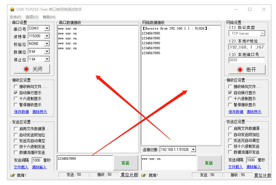 3、測試串口端向網(wǎng)絡(luò)端發(fā)送數(shù)據(jù),網(wǎng)絡(luò)端也可以向串口端發(fā)送數(shù)據(jù)。