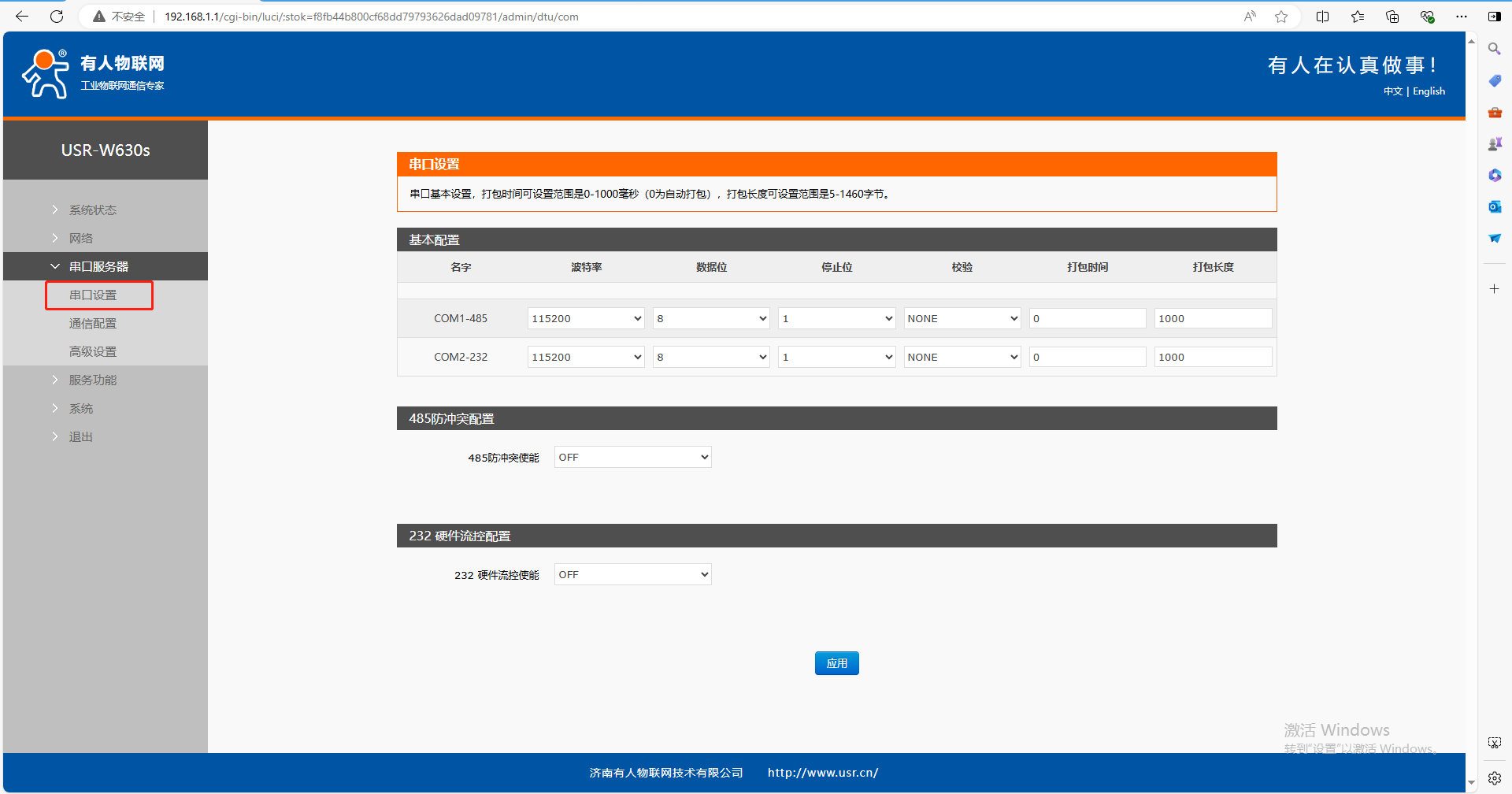 注意:實(shí)際應(yīng)用,根據(jù)USR-W630s實(shí)際使用的串口,修改串口參數(shù),和所接串口設(shè)備的串口參數(shù)保持一致。如果修改參數(shù),需要點(diǎn)擊應(yīng)用。