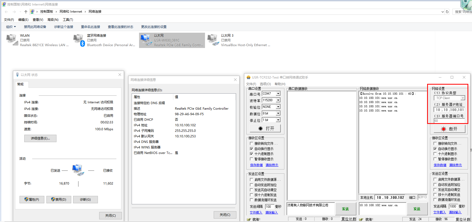 2、第一個電腦打開網(wǎng)絡(luò)調(diào)試助手做TCP server,第二臺電腦打開網(wǎng)絡(luò)調(diào)試助手做TCP client,可以建立TCP連接,可以相互發(fā)送數(shù)據(jù)。