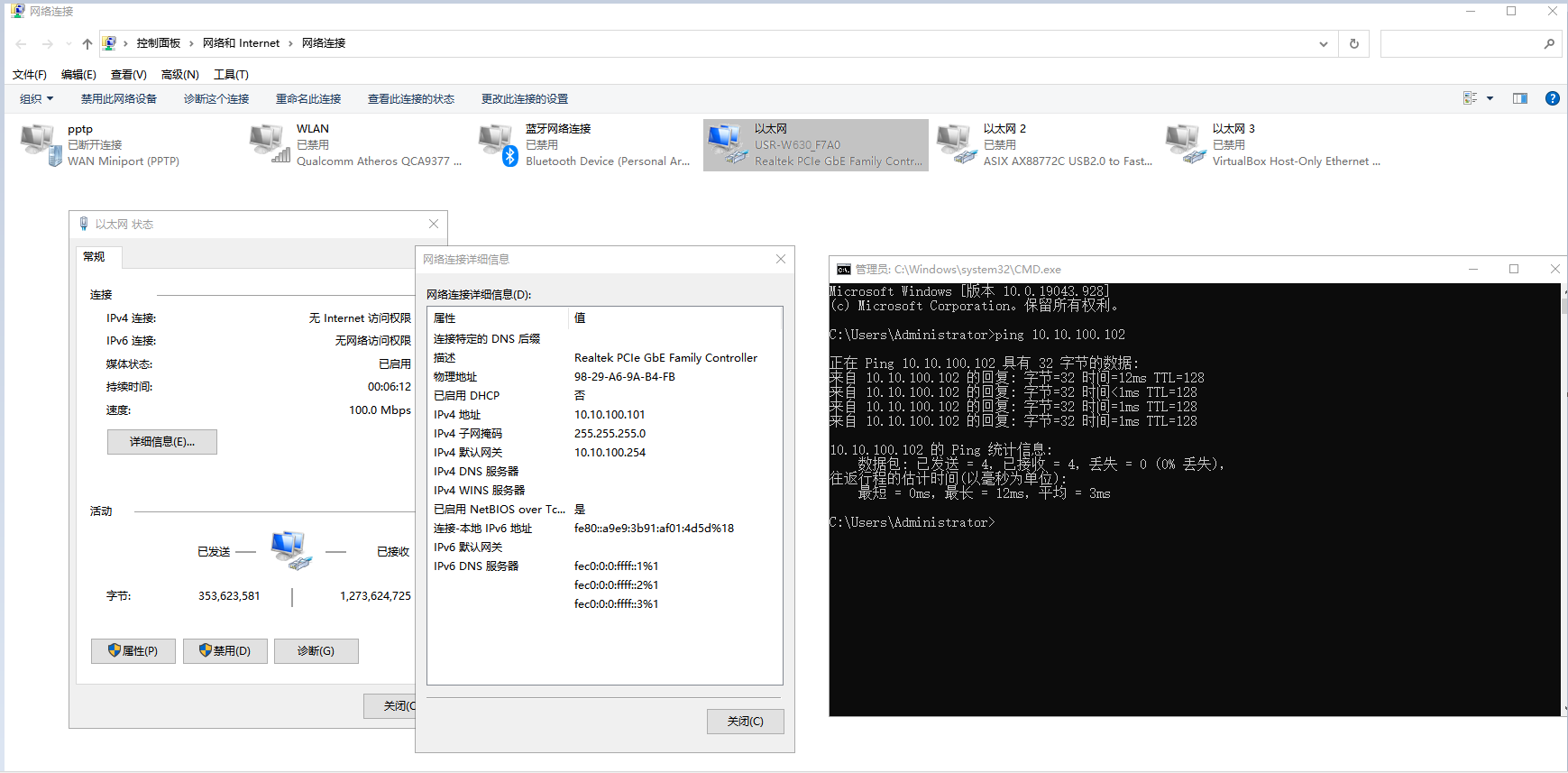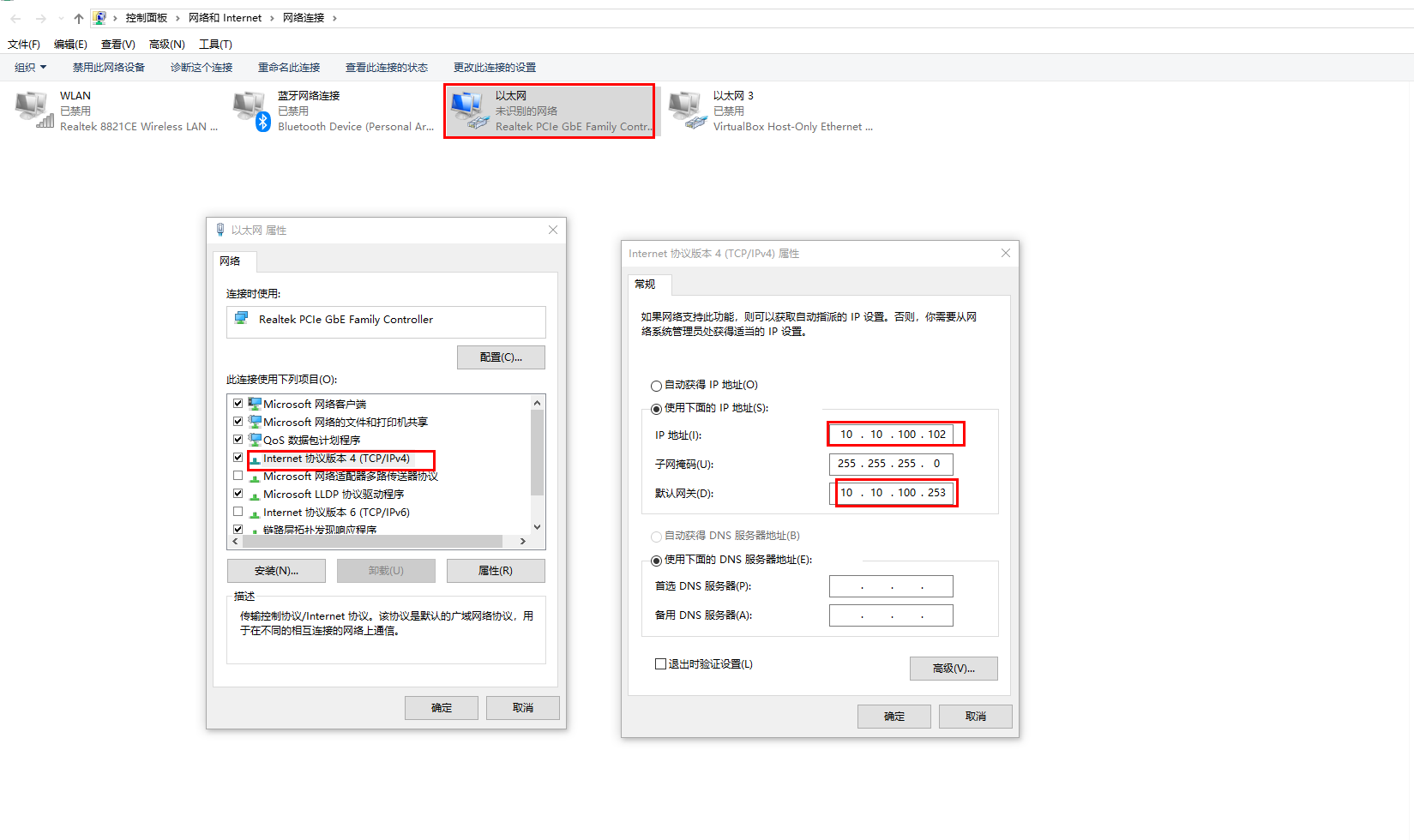 4、打開第2臺電腦的控制面板,將以太網(wǎng)卡設(shè)置靜態(tài)IP,IPv4設(shè)置10.10.100.102,子網(wǎng)掩碼255.255.255.0,默認(rèn)網(wǎng)關(guān)10.10.100.253,點擊確定。