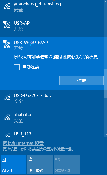 1、禁用其他網(wǎng)卡,保留無線網(wǎng)卡,電腦搜索第一個USR-W630的WiFi名稱USR-W630_F7A0,并連接。