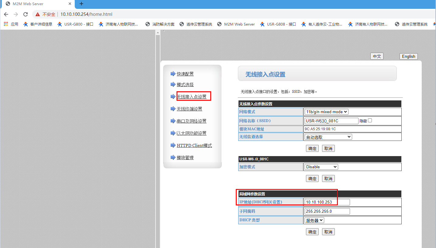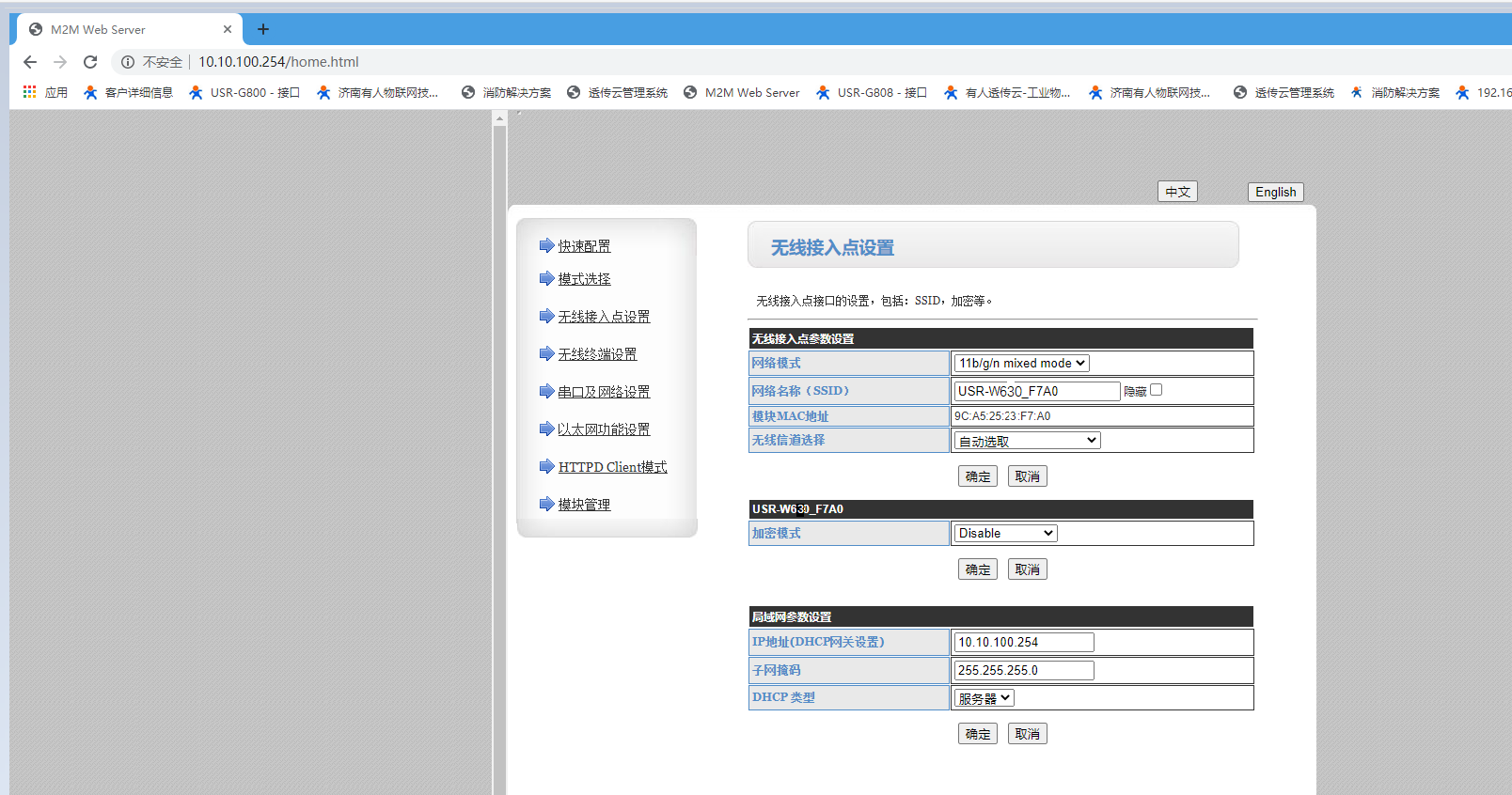 3、設(shè)置AP模式,無線接入點IP設(shè)置10.10.100.254,每設(shè)置一項參數(shù),對應(yīng)點擊下面的確定,最后網(wǎng)頁重啟USR-W630。