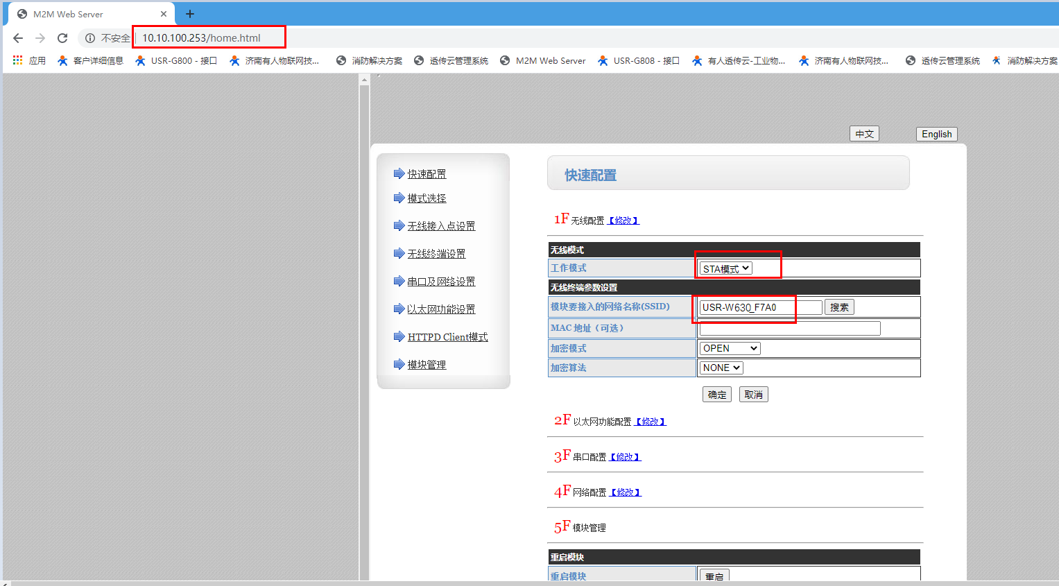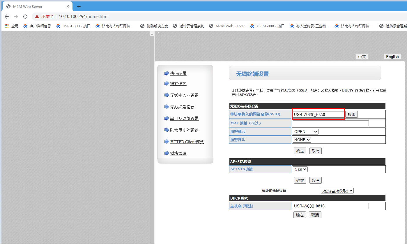 3、設(shè)置STA模式,無線終端,輸入模塊要連接的網(wǎng)絡(luò)名稱USR-W630_F7A0。以太網(wǎng)功能設(shè)置,開啟網(wǎng)口,選擇LAN口,網(wǎng)口模式選擇Z橋接模式。無線接入點IP設(shè)置10.10.100.253。每設(shè)置一項參數(shù),對應(yīng)點擊下面的確定,最后網(wǎng)頁重啟USR-W630。