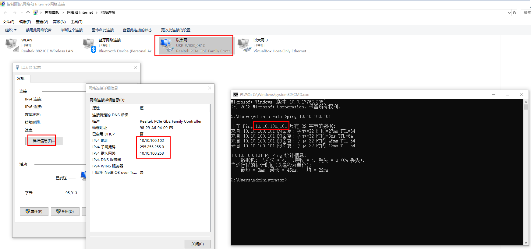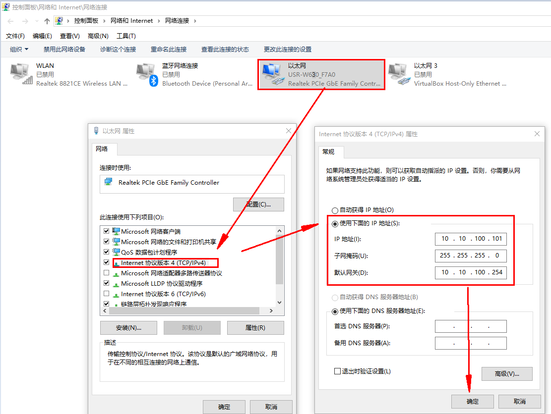 4、打開第1臺電腦的控制面板,將以太網(wǎng)卡設(shè)置靜態(tài)IP,IPv4設(shè)置10.10.100.101,子網(wǎng)掩碼255.255.255.0,默認(rèn)網(wǎng)關(guān)10.10.100.254,點擊確定。