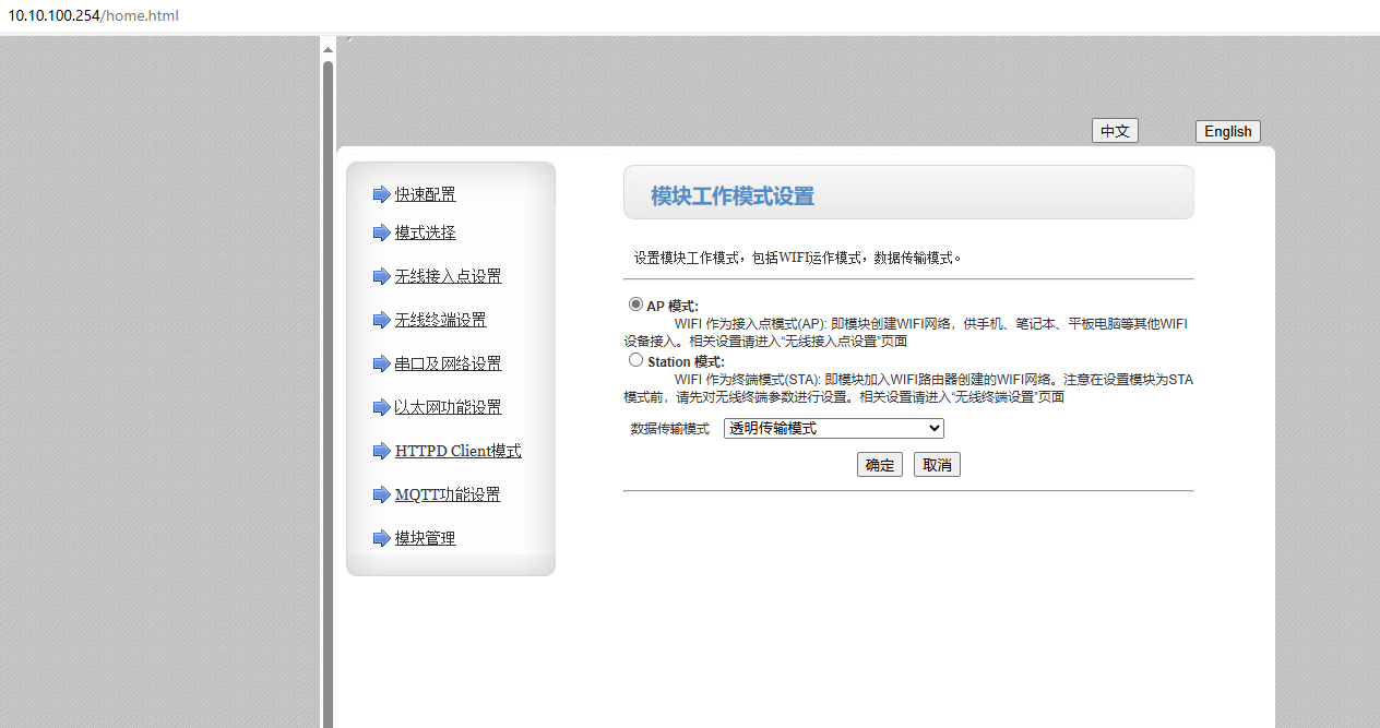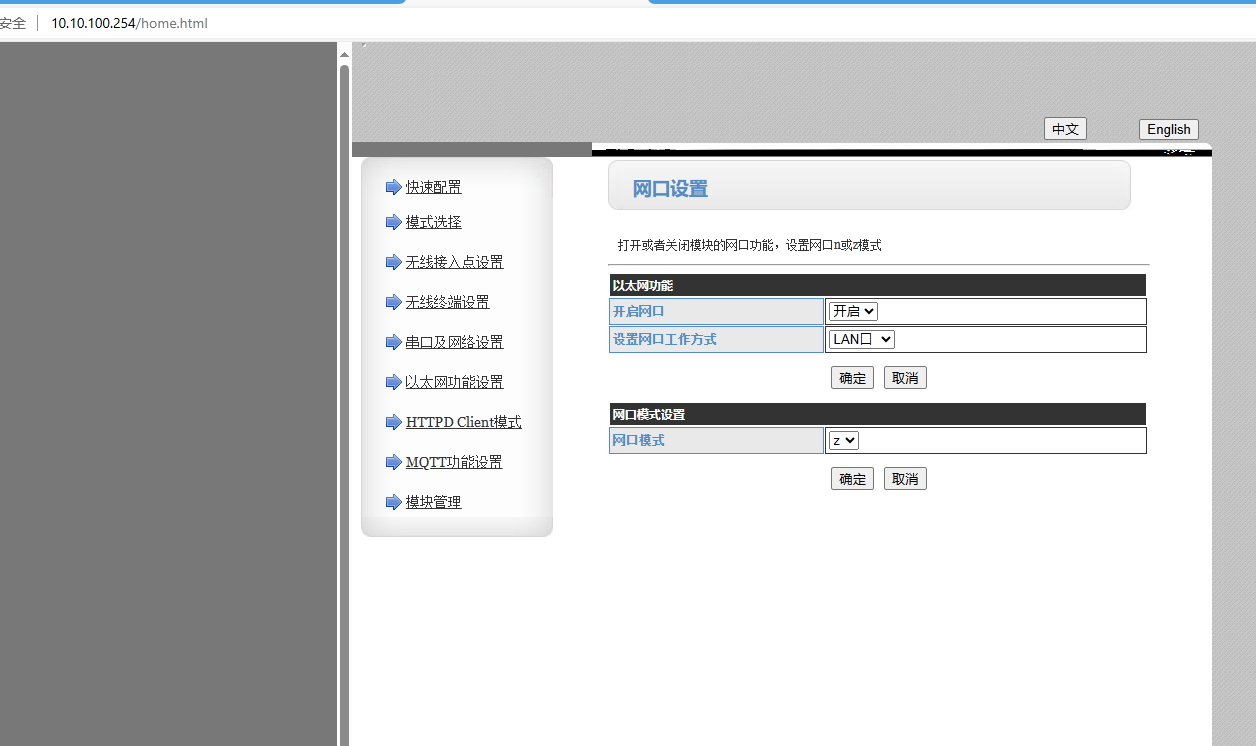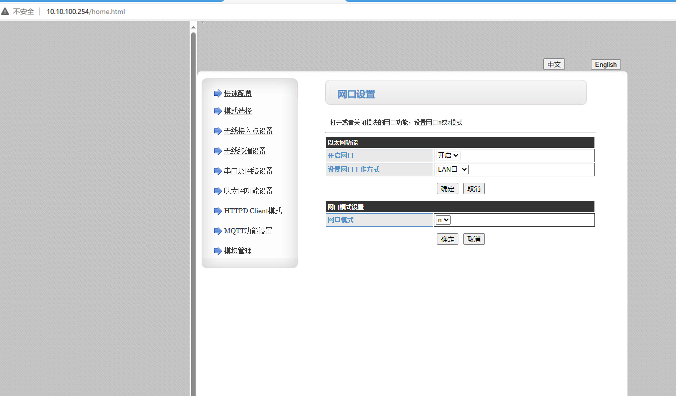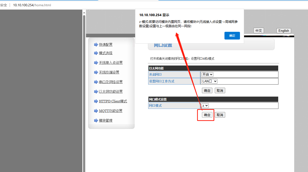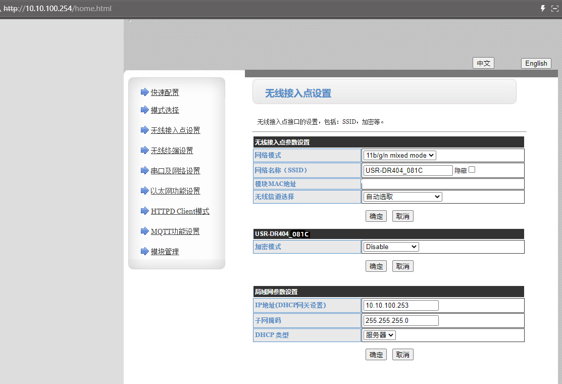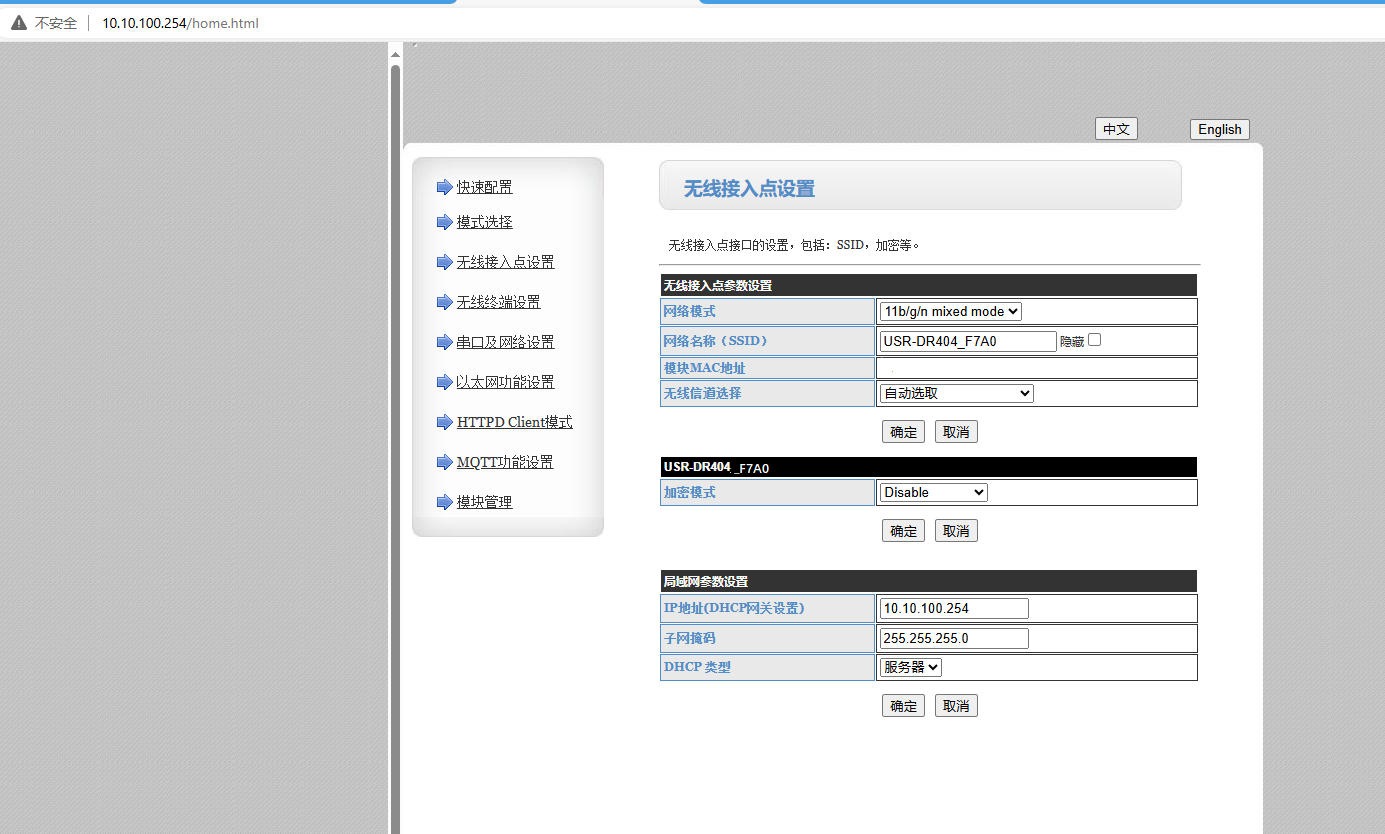 3、設(shè)置AP模式,無(wú)線接入點(diǎn)IP設(shè)置10.10.100.254,以太網(wǎng)功能設(shè)置,開(kāi)啟網(wǎng)口,選擇LAN口,每設(shè)置一項(xiàng)參數(shù),對(duì)應(yīng)點(diǎn)擊下面的確定,最后網(wǎng)頁(yè)重啟USR-DR404。