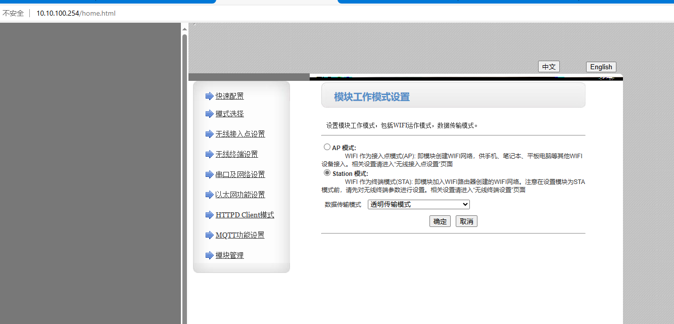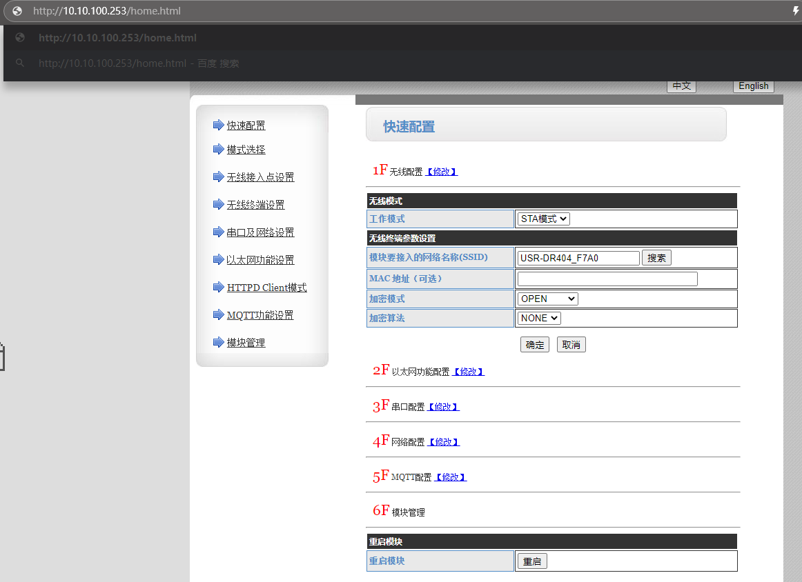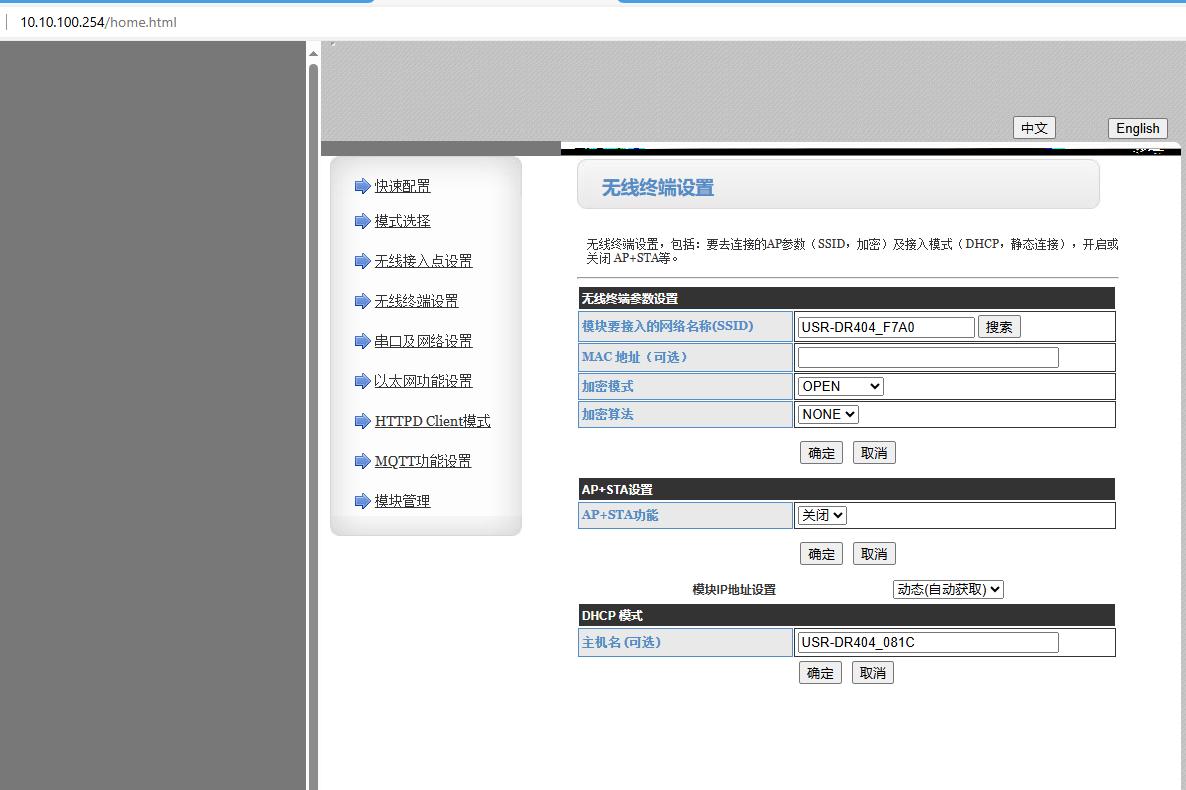 3、設(shè)置STA模式,無(wú)線終端,輸入模塊要連接的網(wǎng)絡(luò)名稱USR-DR404_F7A0。以太網(wǎng)功能設(shè)置,開(kāi)啟網(wǎng)口,選擇LAN口,網(wǎng)口模式選擇Z橋接模式。無(wú)線接入點(diǎn)IP設(shè)置10.10.100.253。每設(shè)置一項(xiàng)參數(shù),對(duì)應(yīng)點(diǎn)擊下面的確定,最后網(wǎng)頁(yè)重啟USR-DR404。