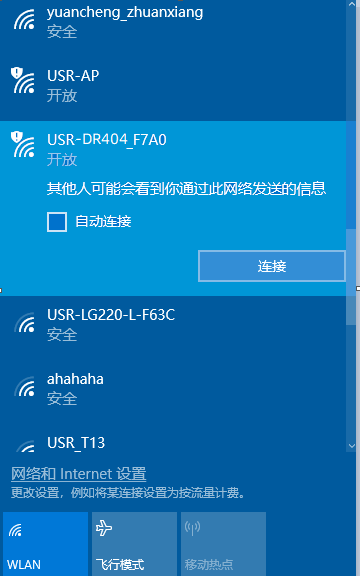 1、禁用其他網(wǎng)卡,保留無(wú)線網(wǎng)卡,電腦搜索第一個(gè)USR-DR404的WiFi名稱USR-DR404_F7A0,并連接。