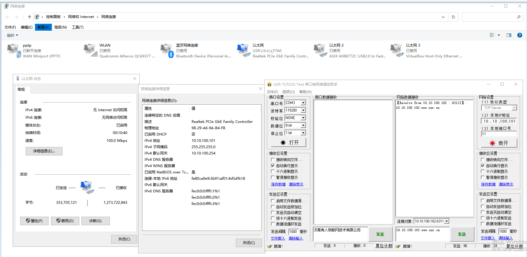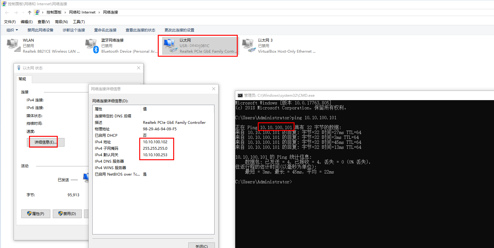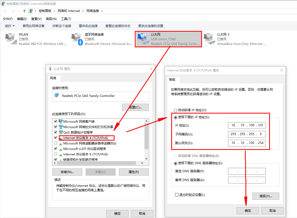 4、打開(kāi)第1臺(tái)電腦的控制面板,將以太網(wǎng)卡設(shè)置靜態(tài)IP,IPv4設(shè)置10.10.100.101,子網(wǎng)掩碼255.255.255.0,默認(rèn)網(wǎng)關(guān)10.10.100.254,點(diǎn)擊確定。