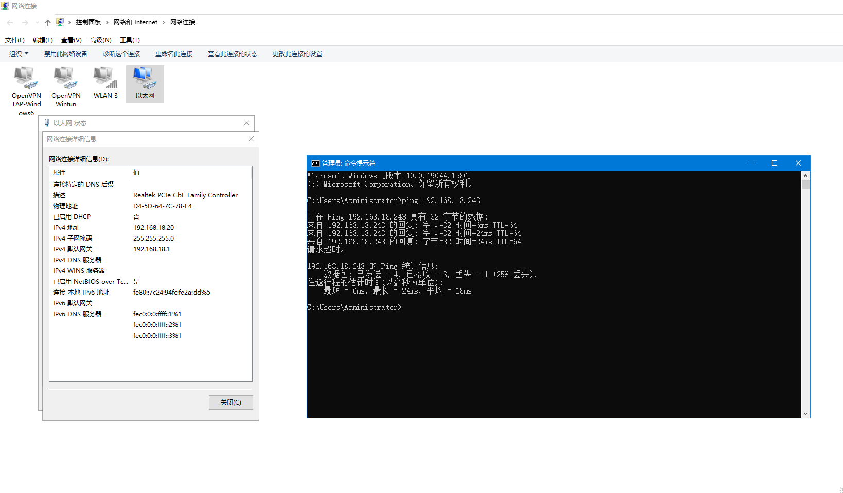 (1)第二臺(tái)電腦用網(wǎng)線連接路由器的LAN口或者無(wú)線連接路由器WiFi,本案例是用無(wú)線連接路由器WiFi,電腦無(wú)線網(wǎng)卡從路由器獲取的IP是192.168.18.243。