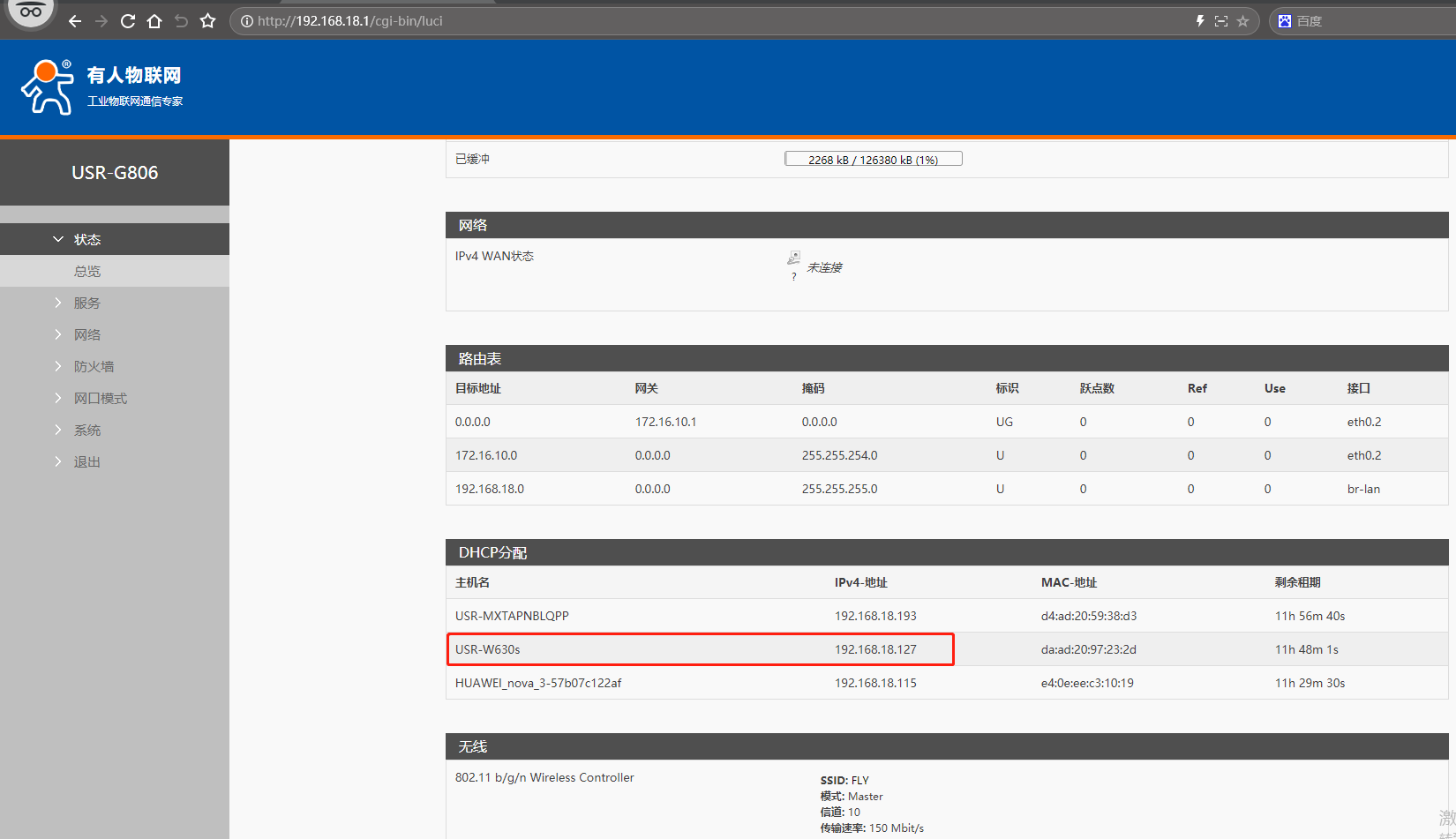 (1)USR-W630s 單獨(dú)設(shè)置STA模式連接路由器,可以登陸路由器網(wǎng)頁(yè)查看路由器分配給USR-W630s的IP,再設(shè)置橋接模式的時(shí)候,可以將這IP 192.168.18.127固定給USR-W630s。