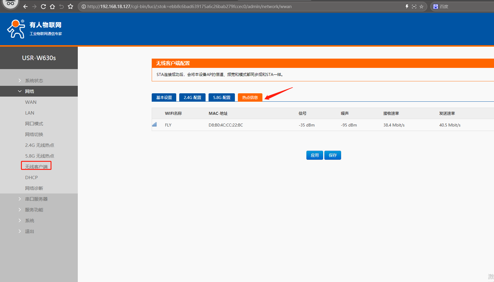 (2)瀏覽器輸入U(xiǎn)SR-W630s 修改后的LAN口IP,192.168.18.127,可以點(diǎn)擊總覽查看網(wǎng)絡(luò)信息,可以點(diǎn)開(kāi)無(wú)線客戶(hù)端,熱點(diǎn)信息,查看連接的路由器信息。