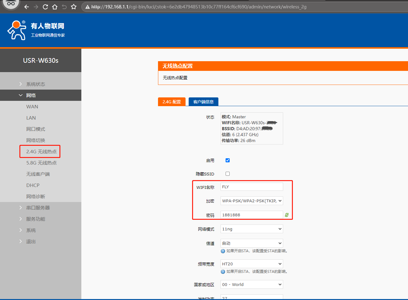 (3)第一個(gè)USR-W630s 做AP模式,點(diǎn)開(kāi)網(wǎng)頁(yè)網(wǎng)絡(luò),點(diǎn)擊2.4G無(wú)線熱點(diǎn),2.4G配置,修改WIFI名稱為FLY,設(shè)置密碼18881888,點(diǎn)擊保存。