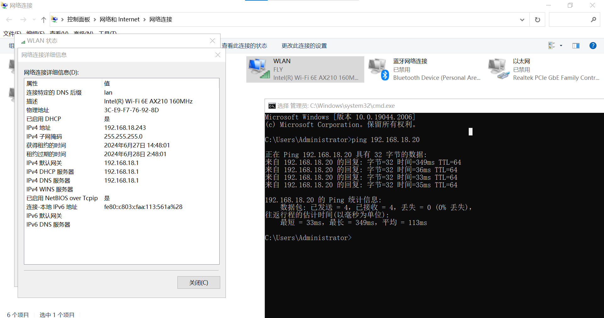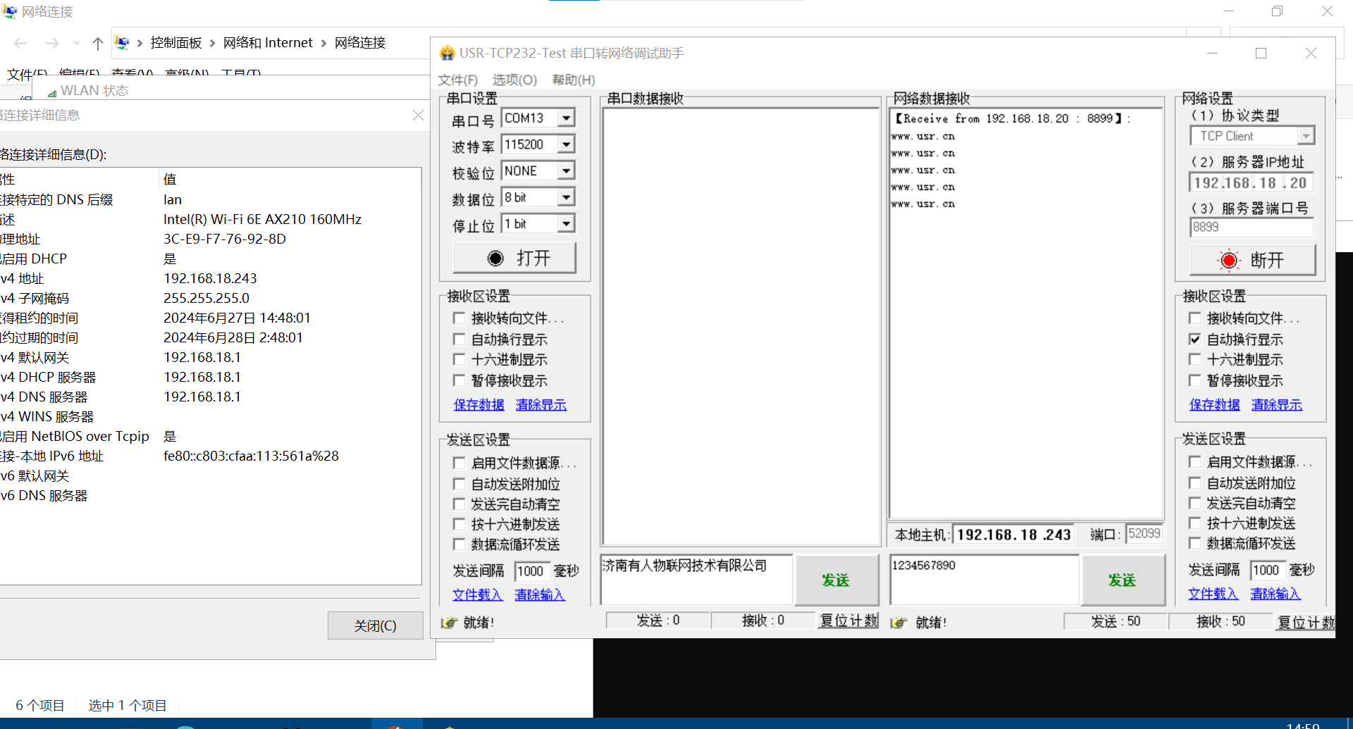 (1)第二臺(tái)電腦無(wú)線連接第1個(gè)USR-W630s WiFi,獲取的IP是192.168.18.243。
