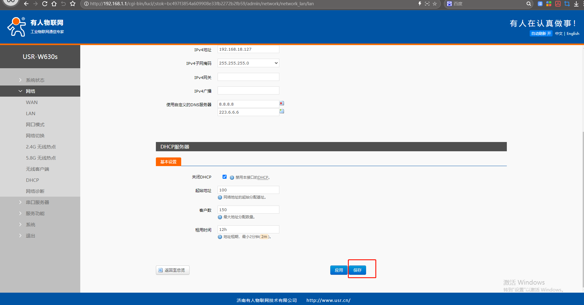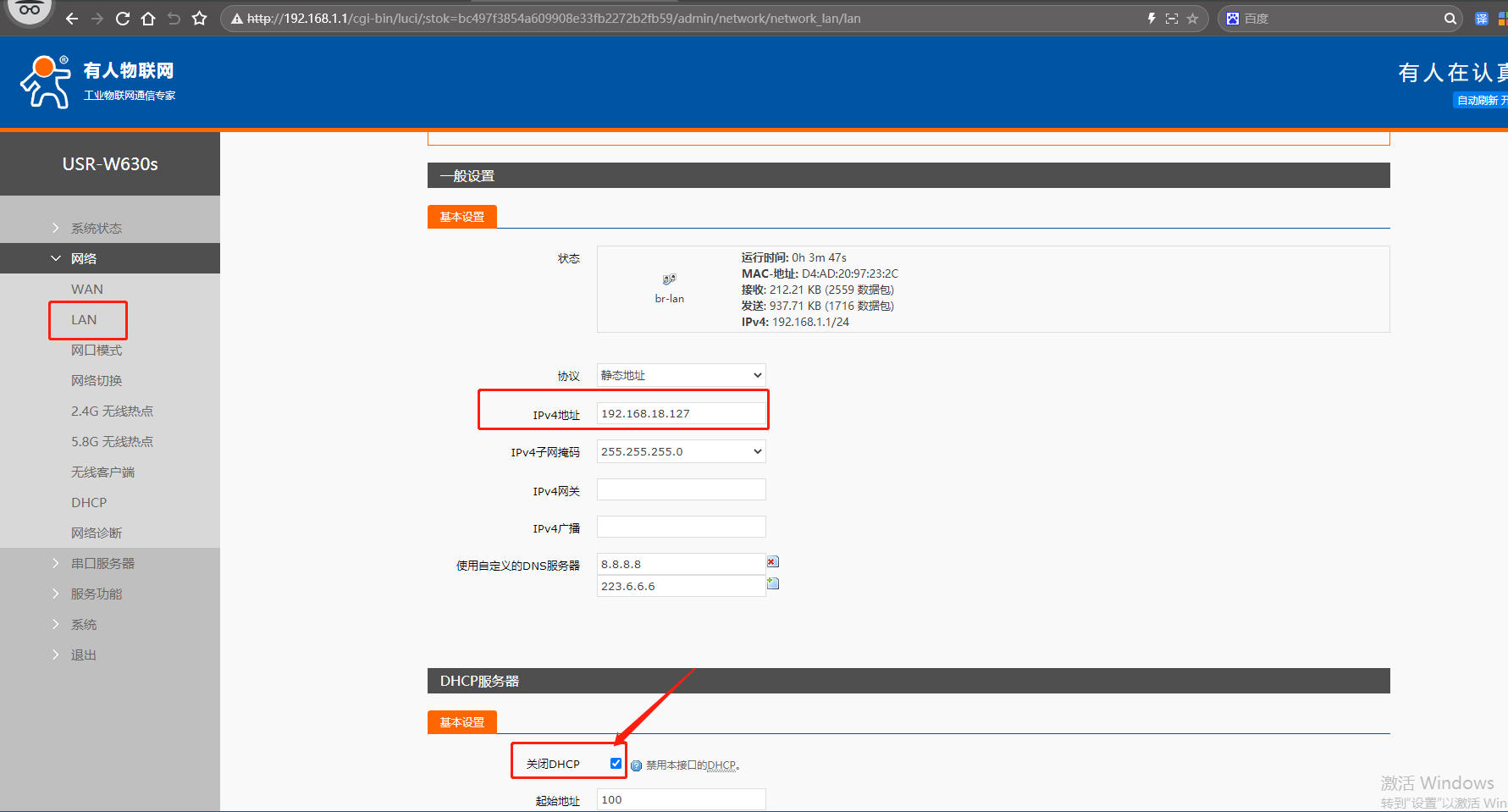 (1)點(diǎn)開(kāi)網(wǎng)頁(yè)網(wǎng)絡(luò),點(diǎn)擊LAN,點(diǎn)擊修改,IPv4地址設(shè)置和USR-W630s STA連接的第1個(gè)USR-W630s IP同網(wǎng)段(不重復(fù)、不沖突的IP)192.168.18.127。DHCP服務(wù)器設(shè)置,關(guān)閉DHCP功能。點(diǎn)擊保存。