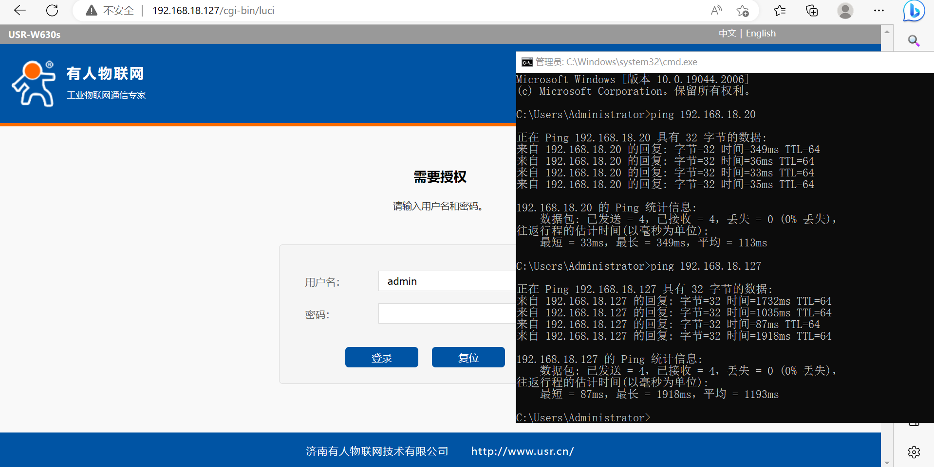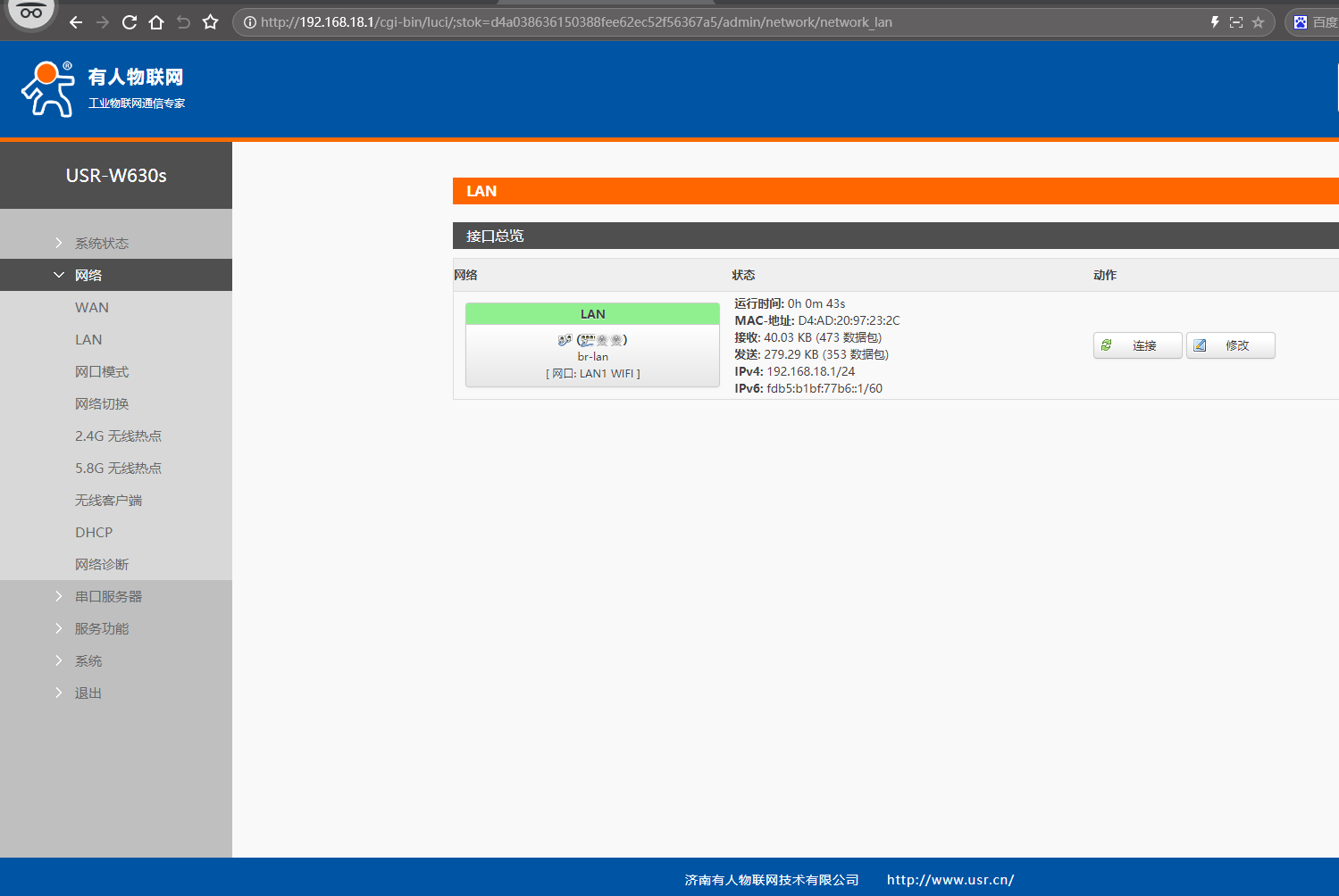 (2)瀏覽器輸入第2個(gè)USR-W630s 修改后的LAN口IP,192.168.18.127。