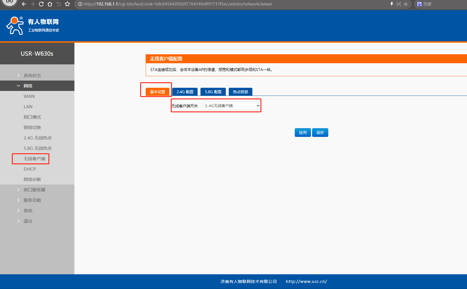 (1)點(diǎn)開(kāi)網(wǎng)頁(yè)網(wǎng)絡(luò),點(diǎn)擊無(wú)線客戶端,點(diǎn)擊基本設(shè)置,無(wú)線客戶端開(kāi)關(guān),選擇2.4G無(wú)線客戶端,點(diǎn)擊保存。