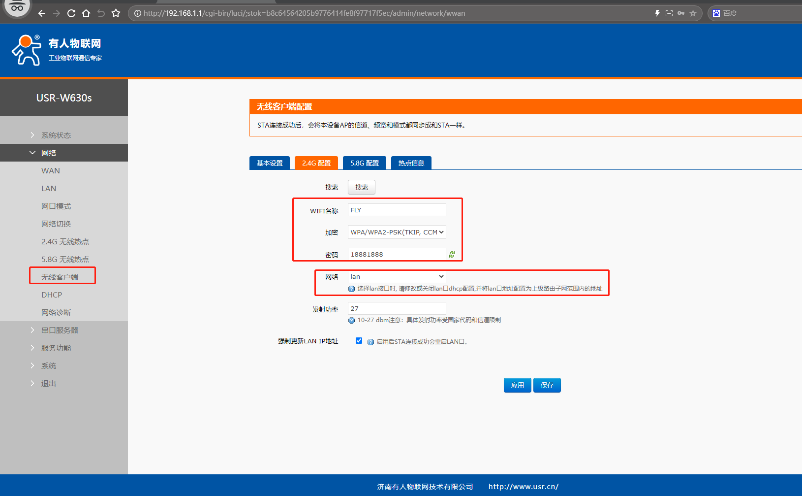 (2)點(diǎn)開(kāi)網(wǎng)頁(yè)2.4G配置,填入STA模式要連接的第1個(gè)USR-W630s WiFi名稱FLY,填入第1個(gè)USR-W630s密碼,網(wǎng)絡(luò)選擇lan。注意選擇lan接口時(shí),請(qǐng)修改或關(guān)閉lan口dhcp配置,并將lan口地址配置為第1個(gè)USR-W630s子網(wǎng)范圍內(nèi)的地址。點(diǎn)擊保存。