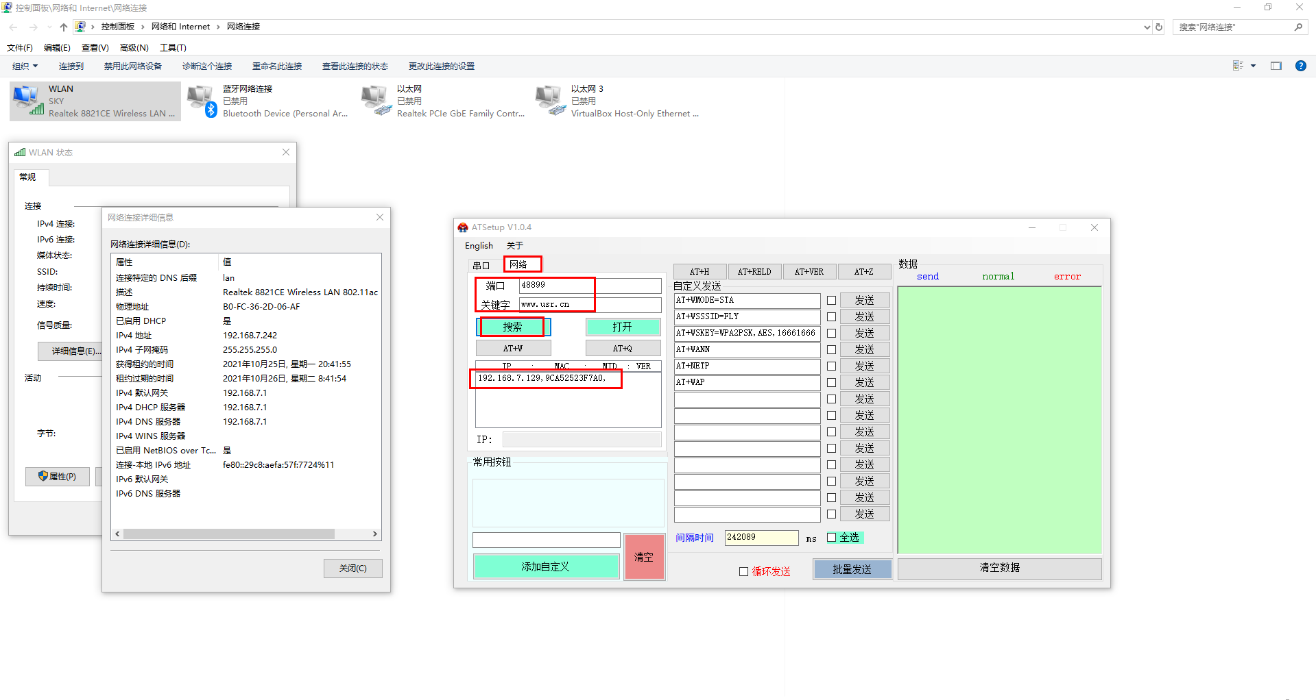 1、USR-W610和電腦連接同一個路由器,電腦打開ATSetup軟件,端口用48899,關(guān)鍵字用www.xyglz.cn,使用搜索功能,搜索這個時候USR-W610連接路由器后,路由器給USR-W610分配的IP。192.168.7.129。