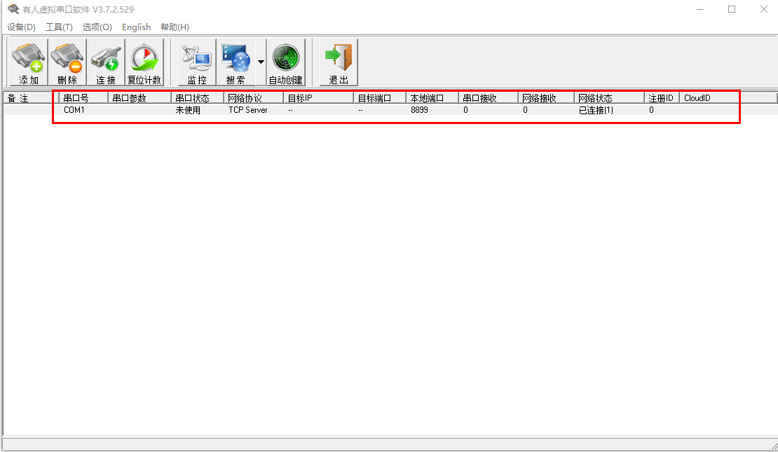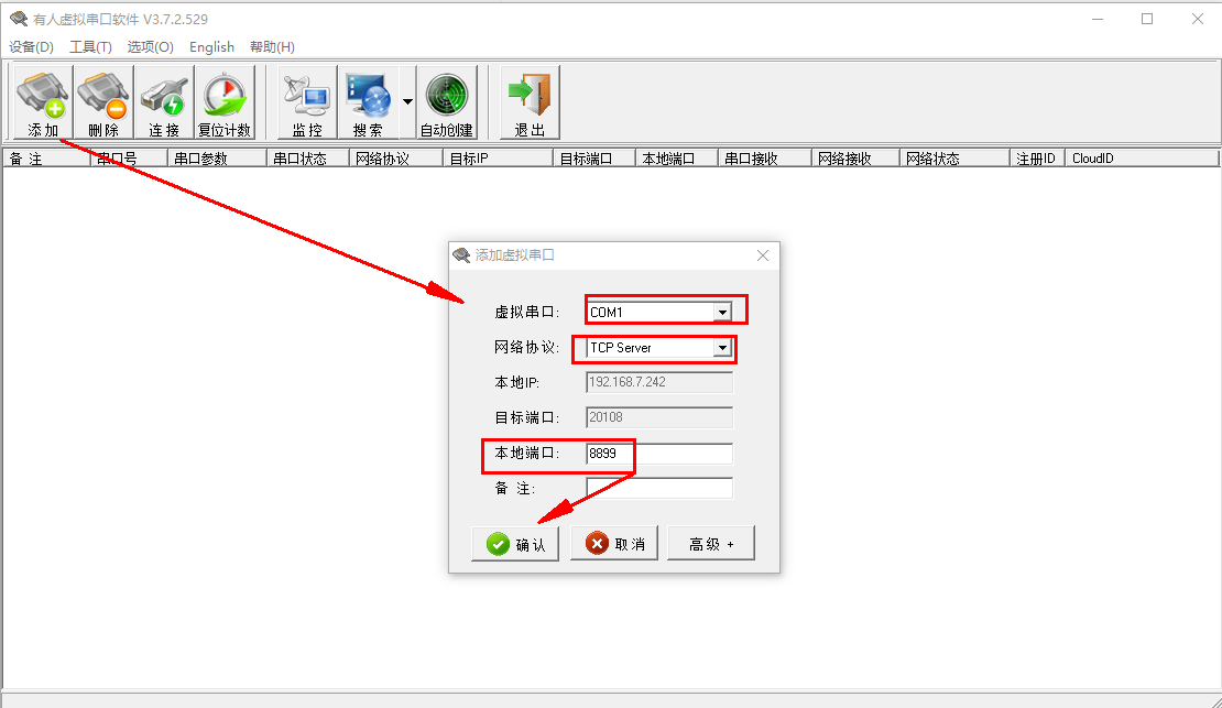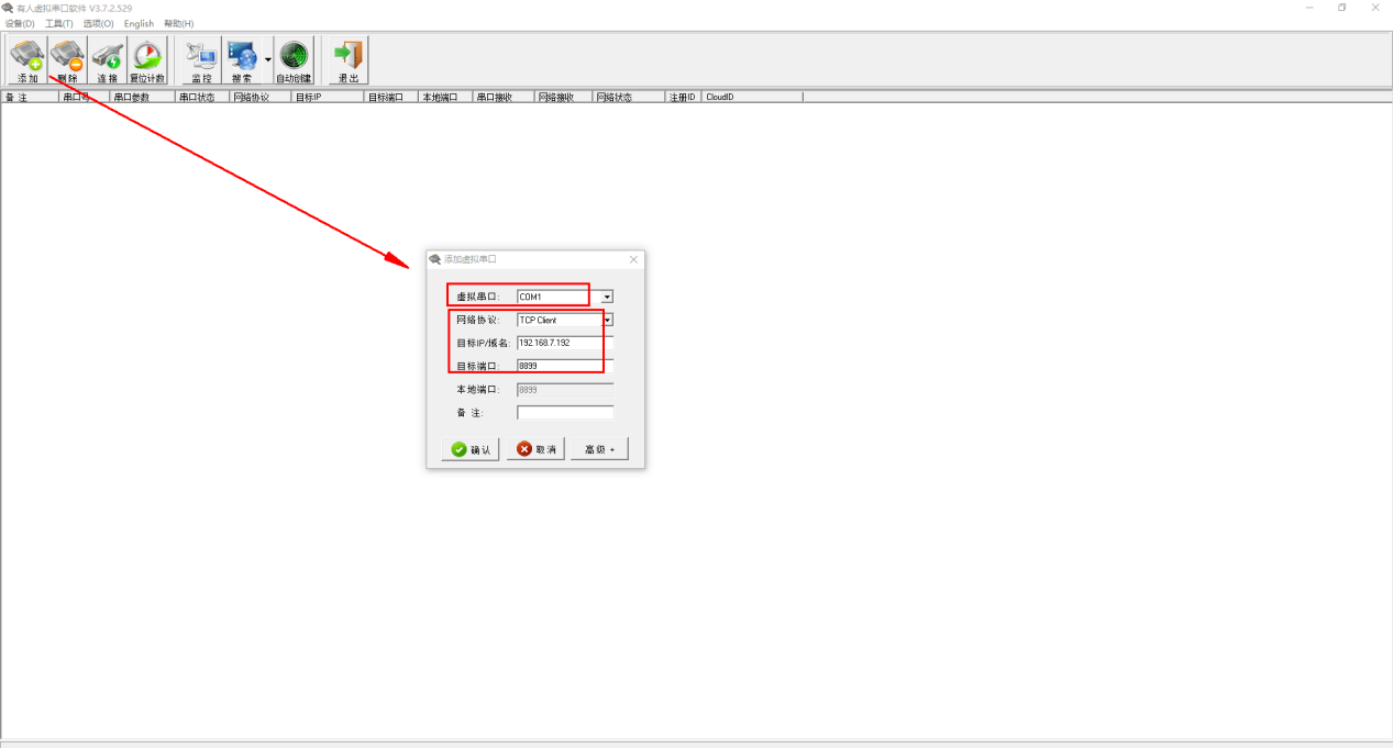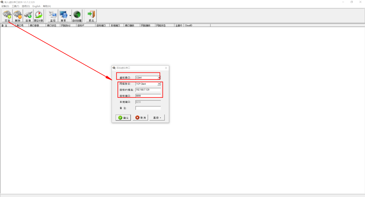 2、虛擬串口軟件,添加一個虛擬串口,網(wǎng)絡(luò)協(xié)議用TCP client,目標(biāo)IP填USR-W610的IP:192.168.7.192,目標(biāo)端口8899,點擊確認(rèn),添加成功。