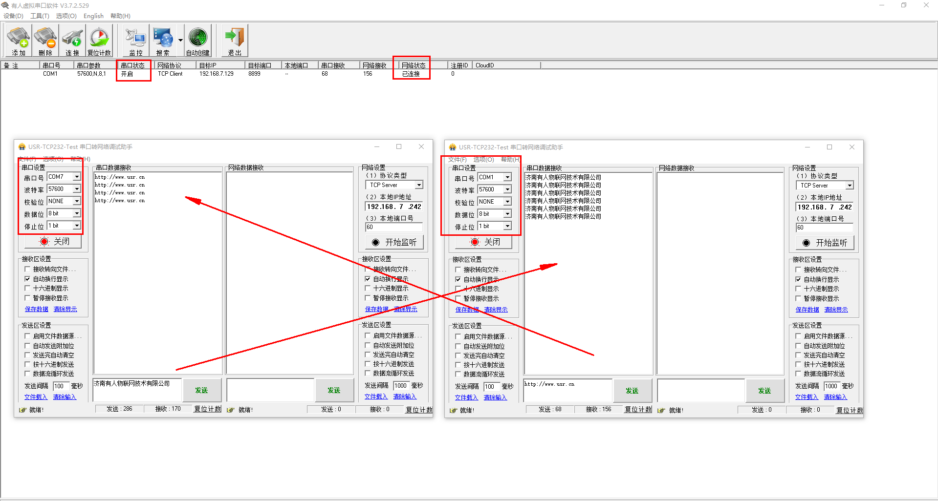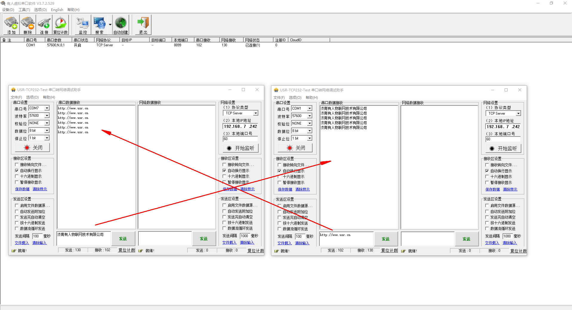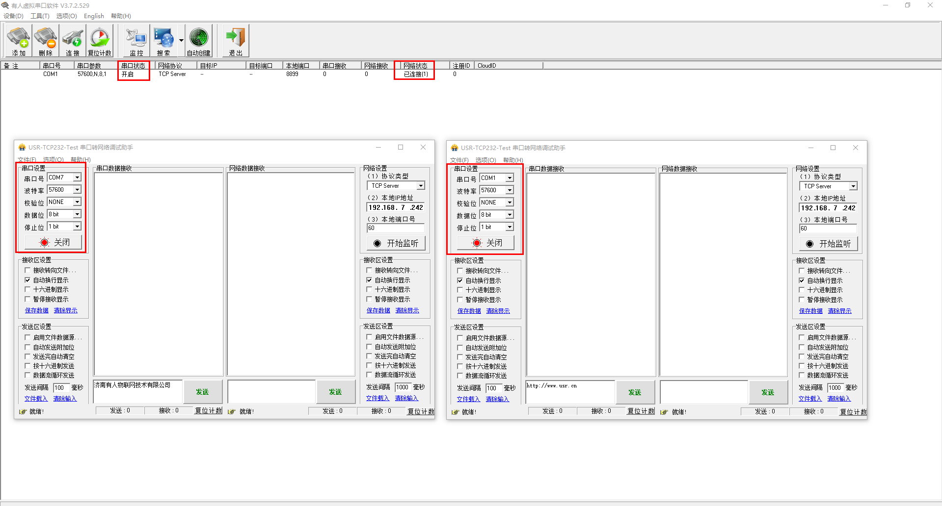 4、使用兩個串口助手,打開實際串口和虛擬串口,然后相互發(fā)送數(shù)據(jù)。