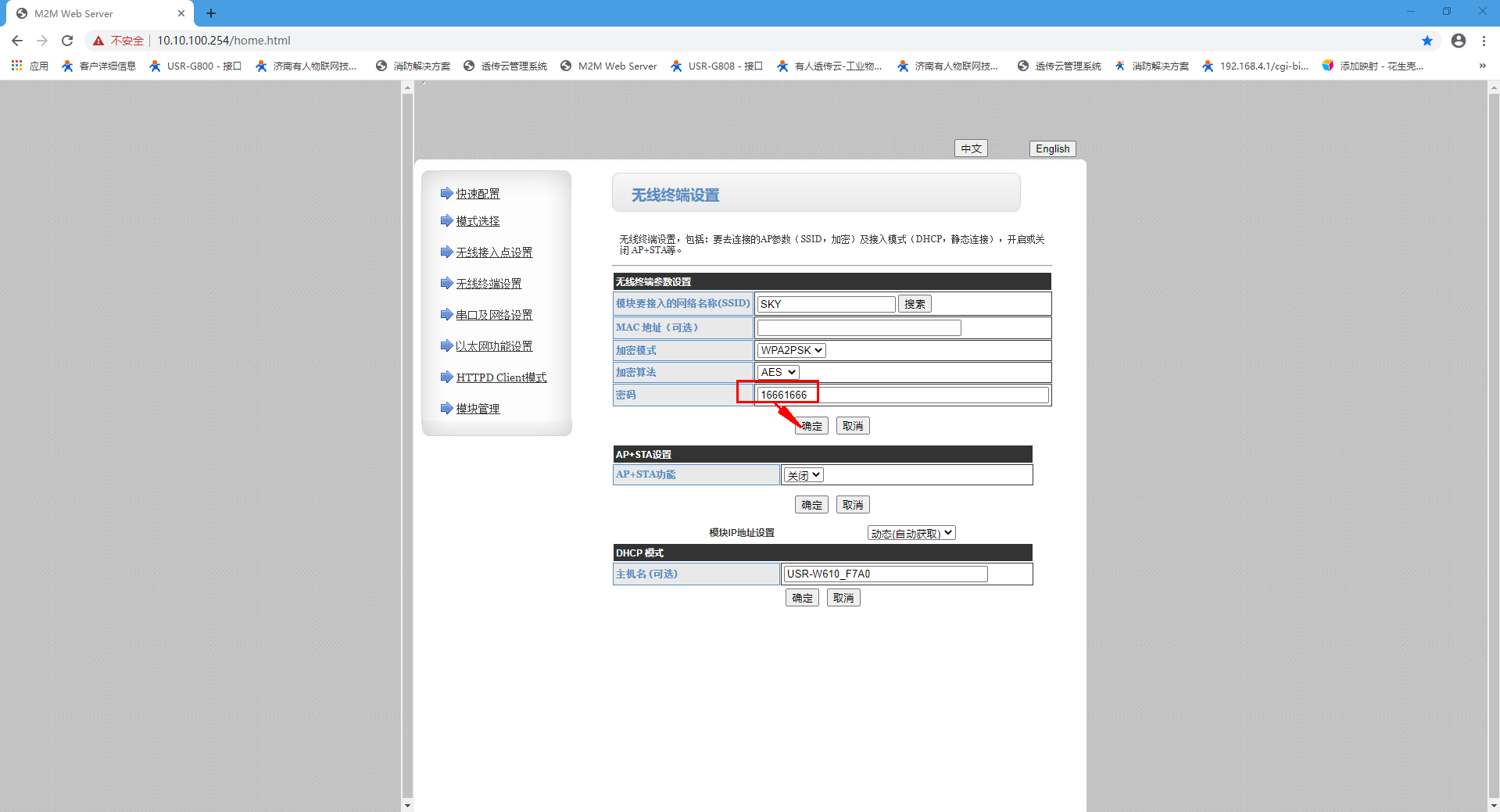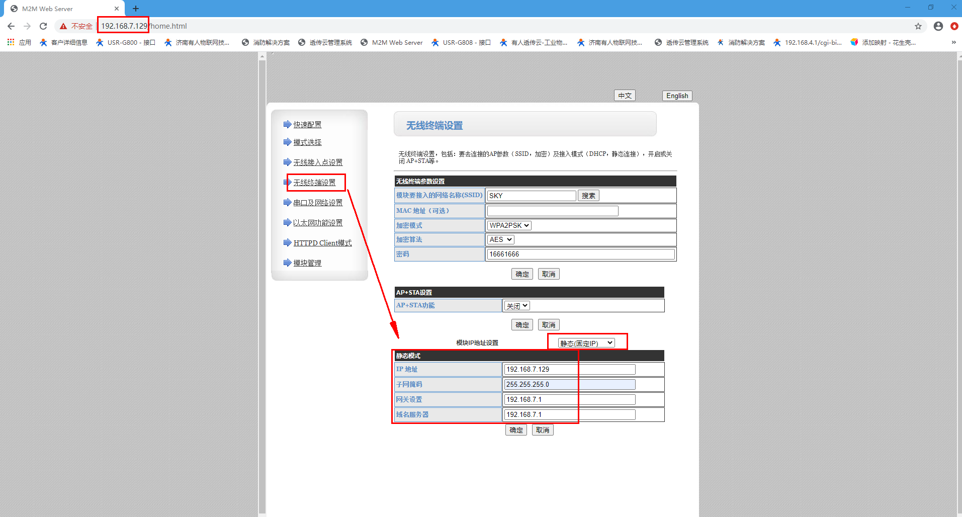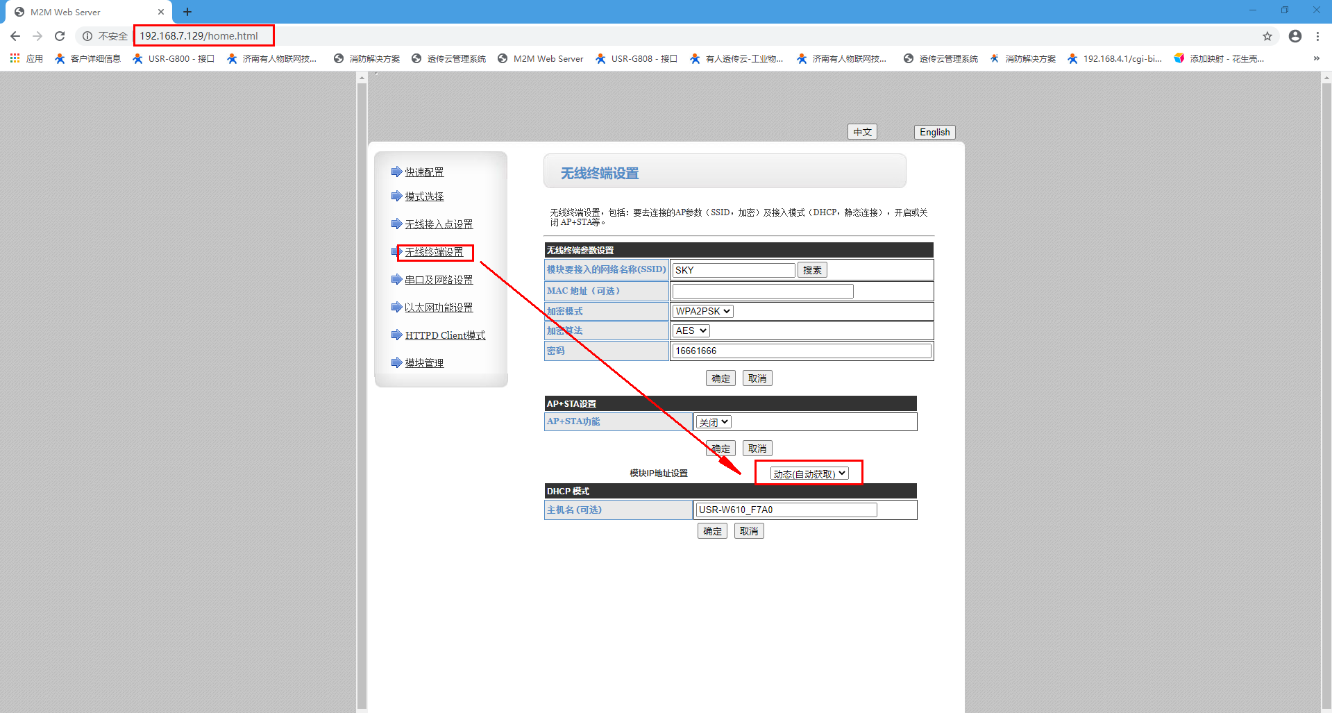3、登錄USR-W610的內(nèi)置網(wǎng)頁后,在無線終端設(shè)置,修改動態(tài)(自動獲?。└臑殪o態(tài)(固定IP)