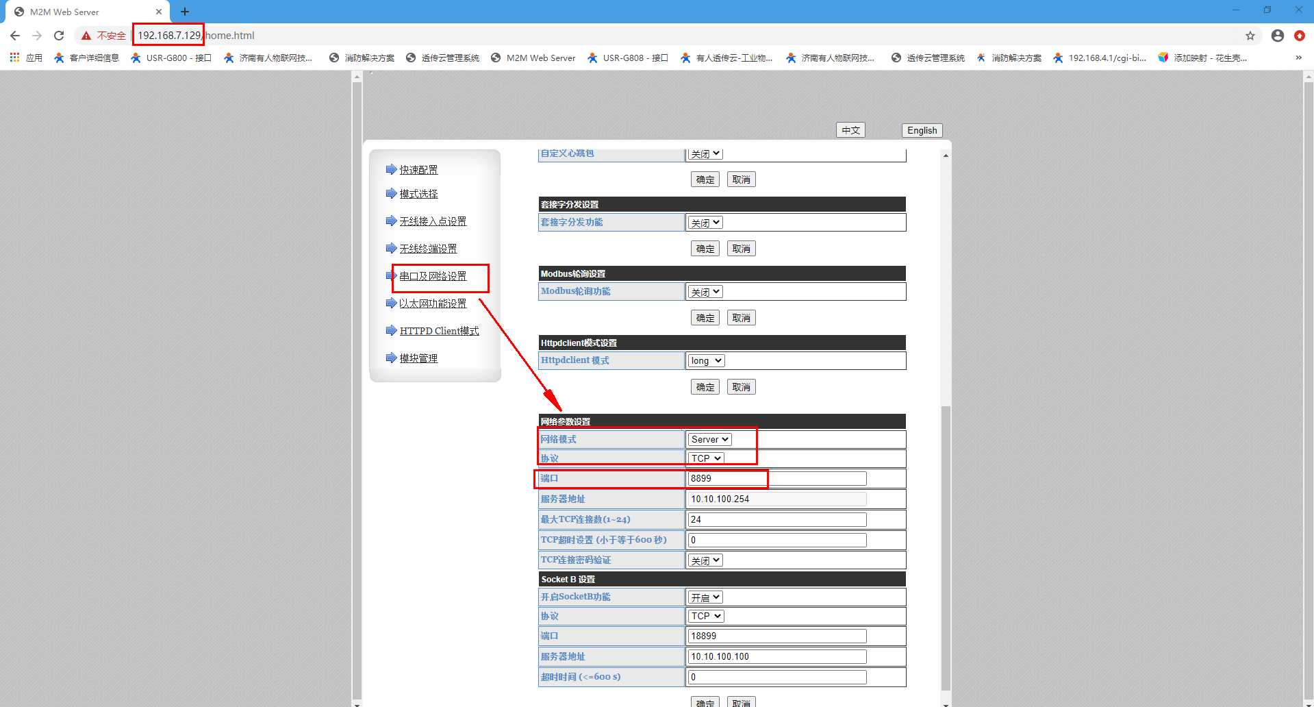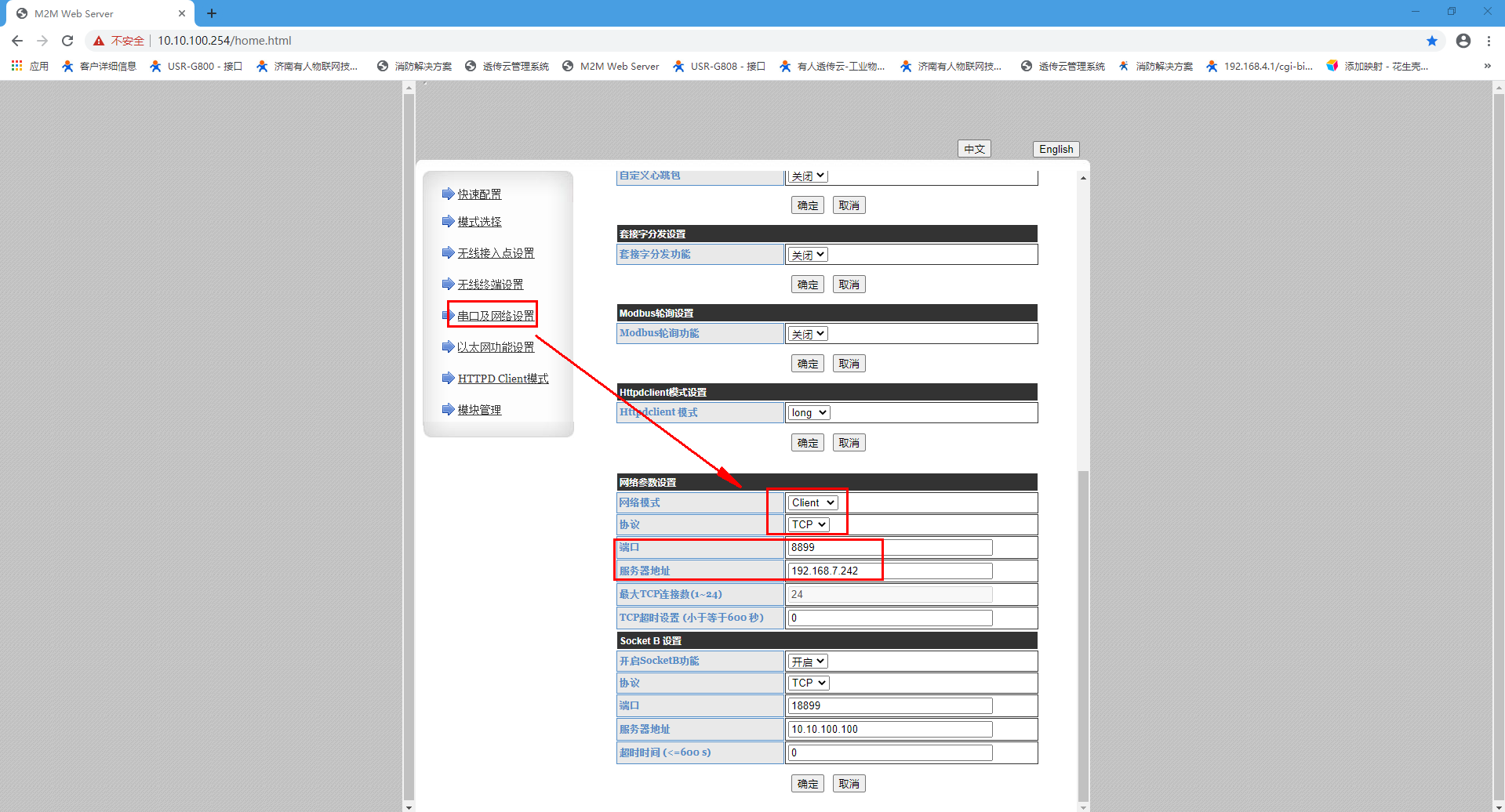 5、USR-W610內(nèi)置網(wǎng)頁,串口及網(wǎng)絡(luò)設(shè)置,設(shè)置協(xié)議TCP,網(wǎng)絡(luò)模式Client,端口8899,服務(wù)器地址填電腦IP 192.168.7.242,點擊確定。最后網(wǎng)頁重啟USR-W610。