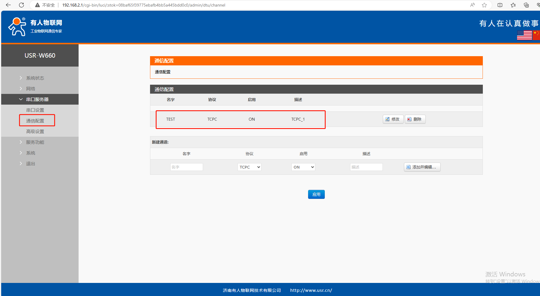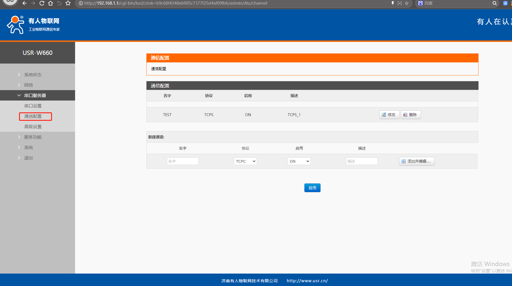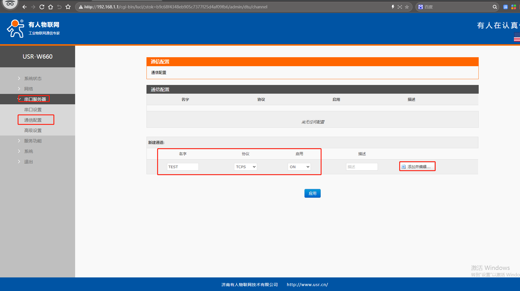 (1)網(wǎng)頁點開串口服務(wù)器,點擊通信配置,USR-W660 AP模式,做TCP server服務(wù)器,網(wǎng)頁新建通道,名字TEST,協(xié)議TCPS,啟用ON,點擊添加并編輯。
