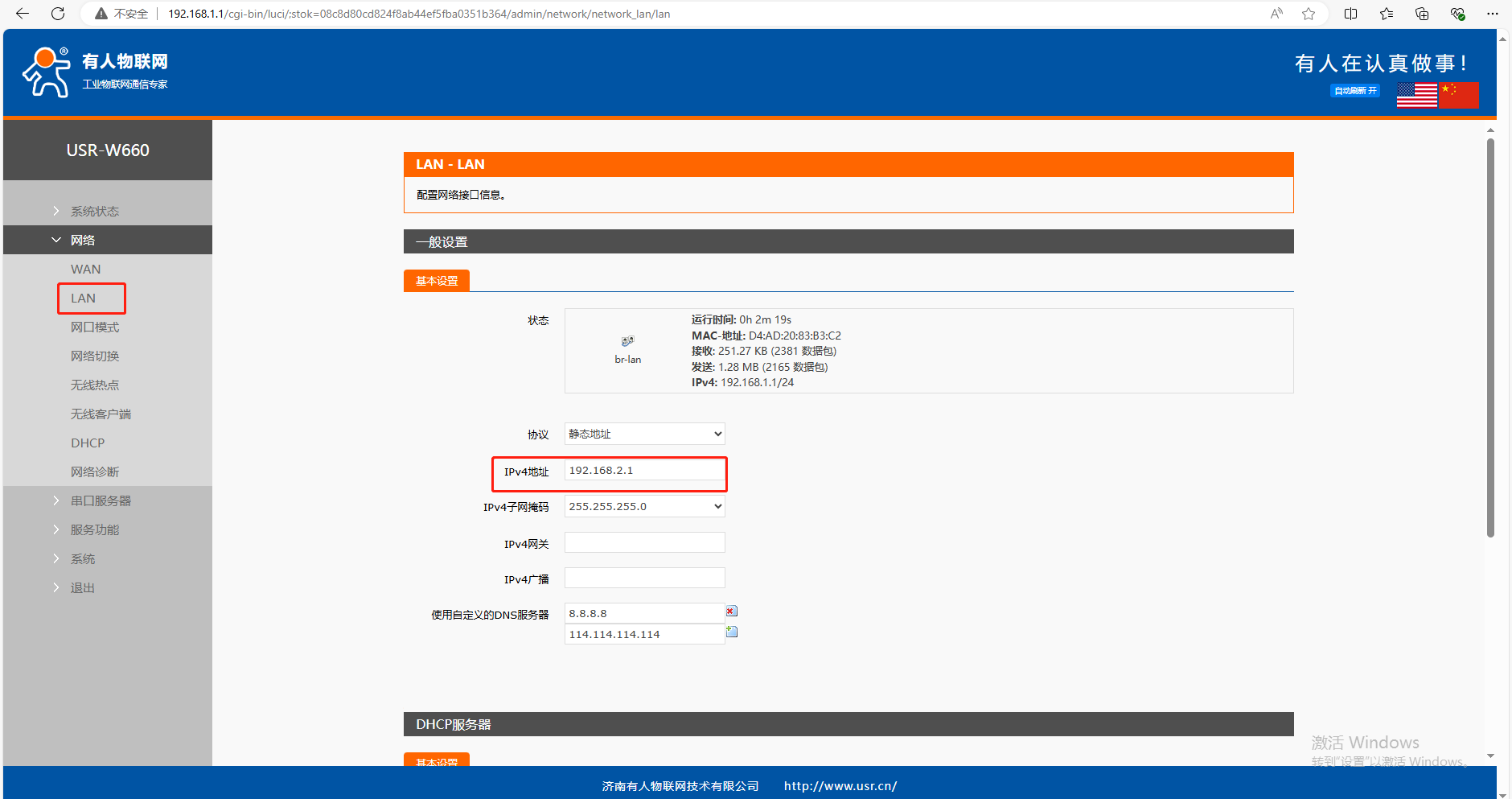 網(wǎng)頁點開網(wǎng)絡(luò),點擊LAN,點擊修改,LAN口的基本設(shè)置,USR-W660做STA模式,IP不要和AP的USR-W660設(shè)置同網(wǎng)段,所以將IP改為其他網(wǎng)段IP 192.168.2.1。