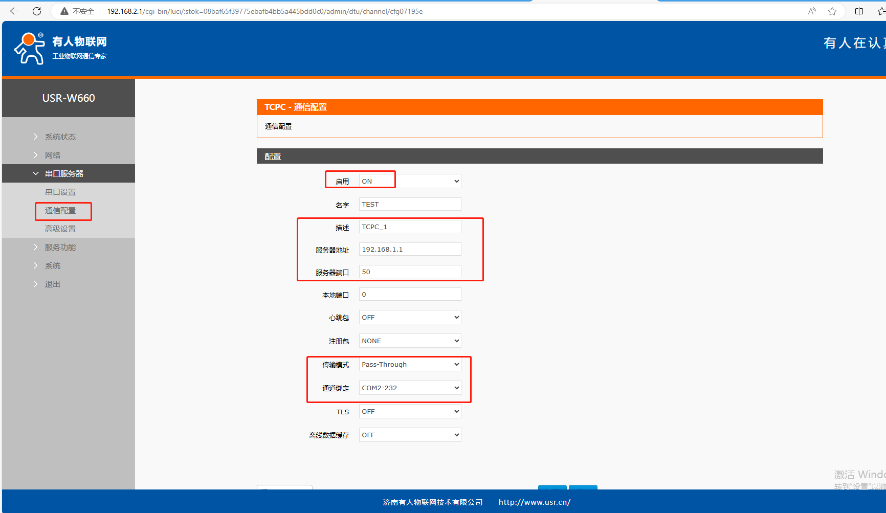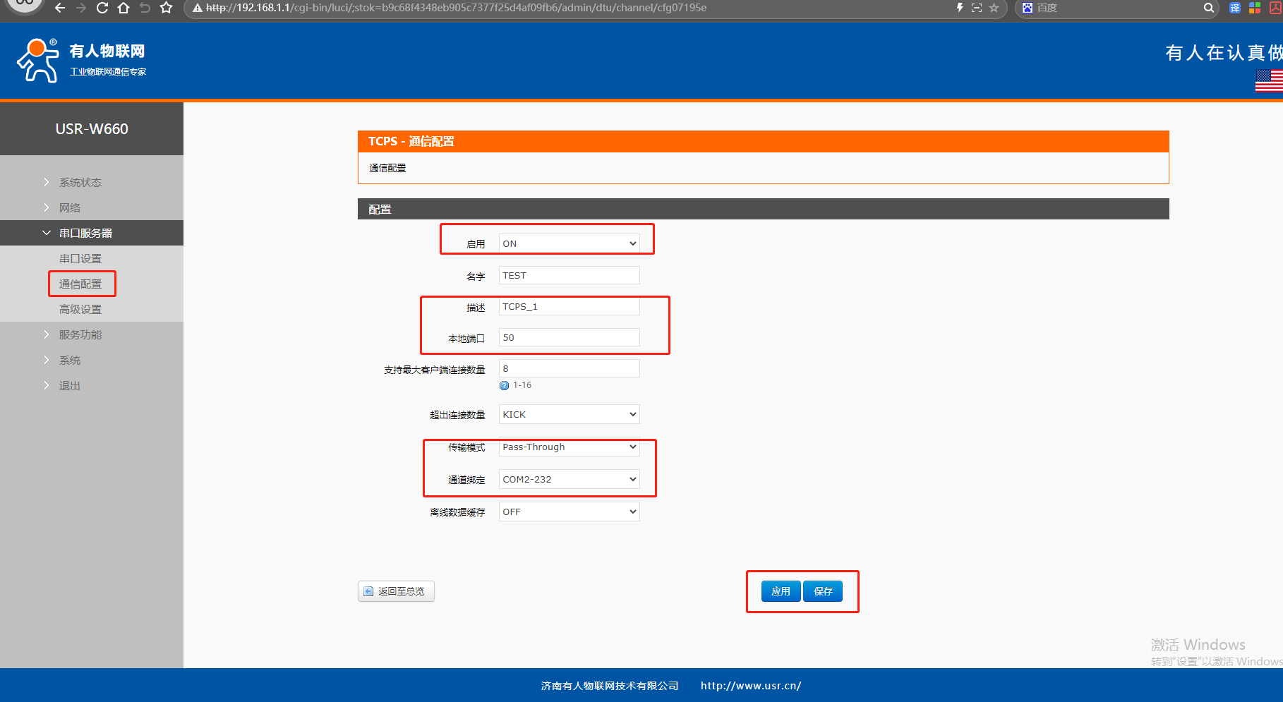 (2)服務(wù)器地址填A(yù)P的USR-W660的IP 192.168.1.1,服務(wù)器端口設(shè)置50,傳輸模式選擇Pass-Through,通道綁定選擇COM2-232。點擊應(yīng)用、保存。