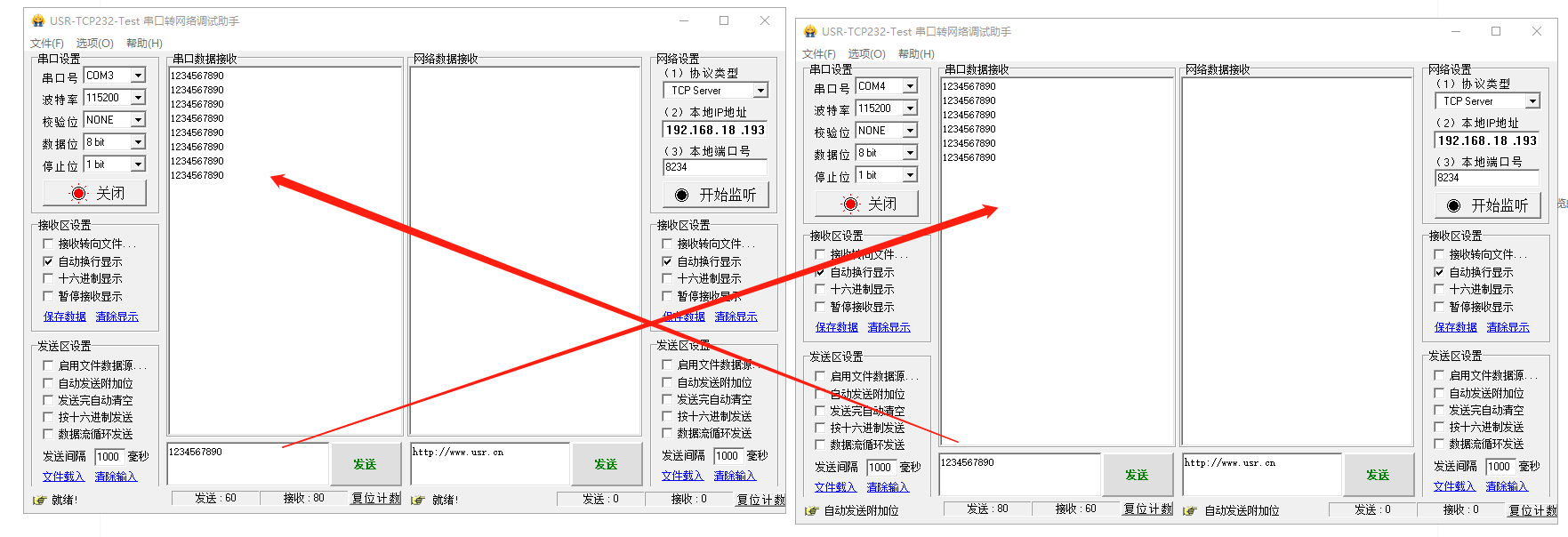 1、打開2個串口助手,分別用2個USR-W660實際USB串口COM,COM3、COM4打開串口,串口參數(shù)設(shè)置和USR-W660一致。